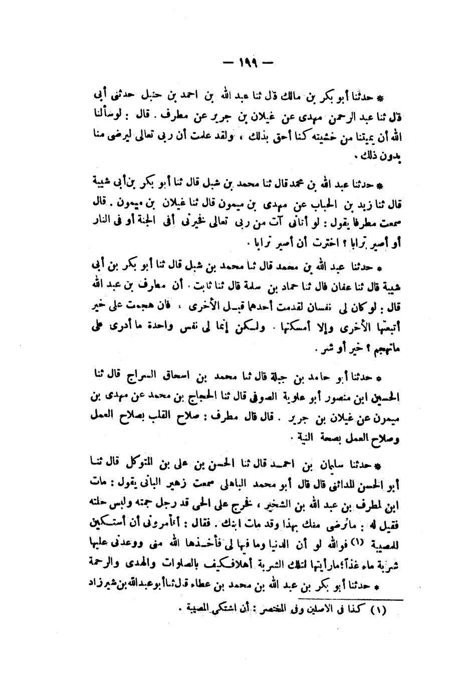 حَدَّثَنَا عَبْدُ اللهِ بْنُ مُحَمَّدٍ، قَالَ: ثنا مُحَمَّدُ بْنُ شِبْلٍ، ثنا أَبُو بَكْرِ بْنُ أَبِي شَيْبَةَ، قَالَ: ثنا عَفَّانُ، قَالَ: ثنا حَمَّادُ بْنُ سَلَمَةَ، قَالَ: ثنا ثَابِتٌ، أَنَّ مُطَرِّفَ بْنَ عَبْدِ اللهِ، قَالَ: «§لَوْ كَانَ لِي نَفْسَانِ لَقَدَّمْتُ إِحَدَاهُمَا قَبْلَ الْأُخْرَى فَإِنْ هَجَمَتْ عَلَى خَيْرٍ أَتْبَعْتُهَا الْأُخْرَى وَإِلَّا أَمْسَكْتُهَا، وَلَكِنْ إِنَّمَا لِي نَفْسٌ وَاحِدَةٌ مَا أَدْرِي عَلَى مَا تَهْجِمُ، خَيْرٍ أَوْ شَرٍّ»