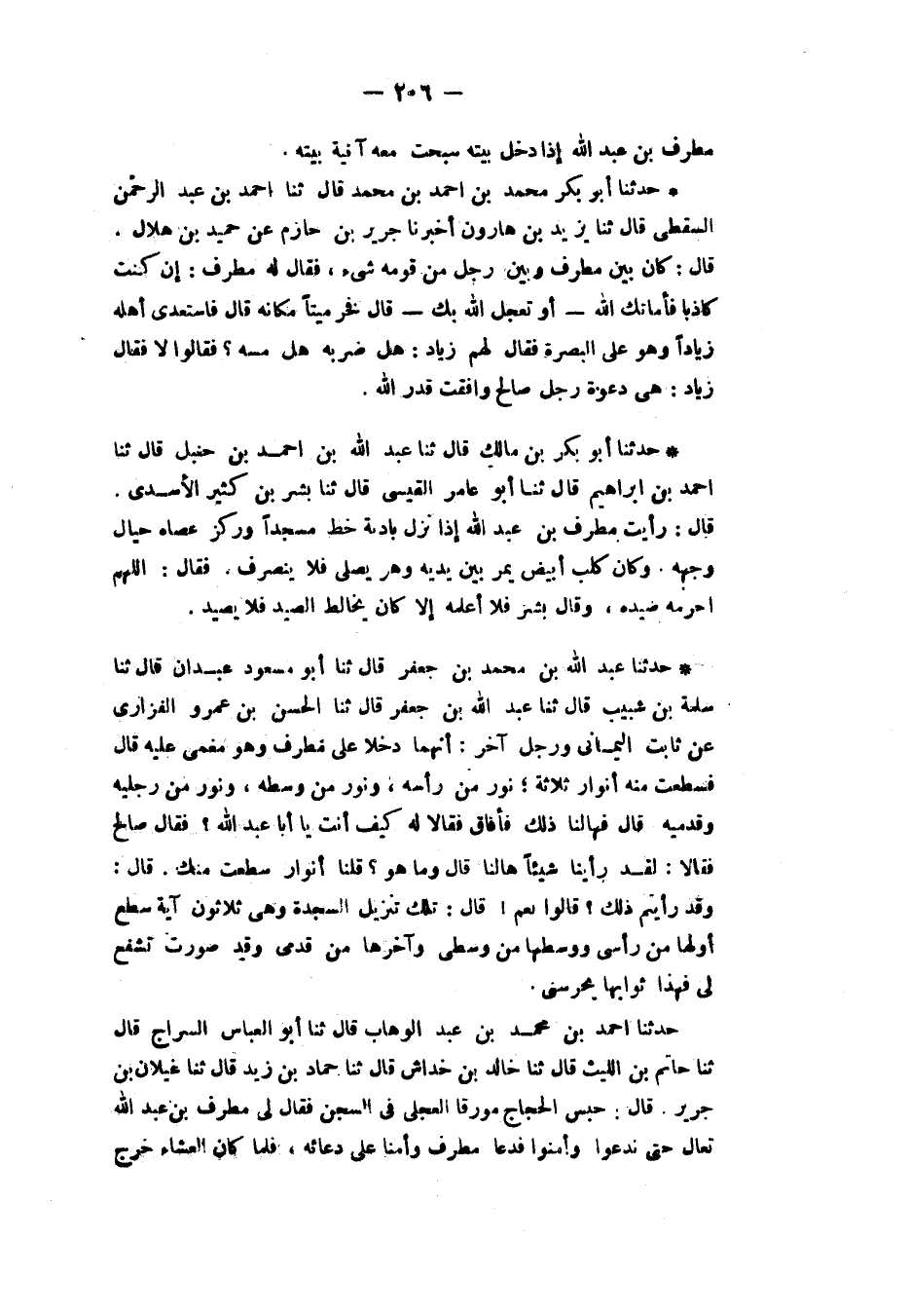حَدَّثَنَا أَبُو بَكْرِ بْنُ مَالِكٍ، قَالَ: ثنا عَبْدُ اللهِ بْنُ أَحْمَدَ بْنِ حَنْبَلٍ، قَالَ: ثنا أَحْمَدُ بْنُ إِبْرَاهِيمَ، قَالَ: ثنا أَبُو عَامِرٍ الْقَيْسِيُّ، قَالَ: ثنا بِشْرُ بْنُ كَثِيرٍ الْأَسَدِيُّ، قَالَ رَأَيْتُ مُطَرِّفَ بْنَ عَبْدِ اللهِ §إِذَا نَزَلَ بَادِيَةً خَطَّ مَسْجِدًا وَرَكَّزَ عَصَاهُ حِيَالَ وَجْهِهِ وَكَانَ كَلْبٌ أَبْيَضُ يَمُرُّ بَيْنَ يَدَيْهِ وَهُوَ يُصَلِّي فَلَا يَنْصَرِفُ فَقَالَ: «اللهُمَّ أَحْرِمْهُ صَيْدَهُ» وَقَالَ بِشْرٌ: فَلَا أَعْلَمُهُ إِلَّا كَانَ يُخَالِطُ الصَّيْدَ فَلَا يَصِيدُ