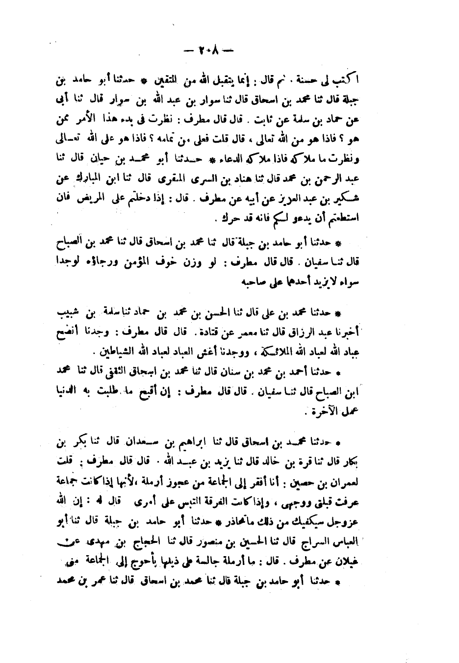 حَدَّثَنَا أَبُو حَامِدِ بْنُ جَبَلَةَ، قَالَ: ثنا مُحَمَّدُ بْنُ إِسْحَاقَ قَالَ: ثنا سَوَّارُ بْنُ عَبْدِ اللهِ بْنِ سَوَّارٍ، قَالَ: ثنا أَبِي، عَنْ حَمَّادِ بْنِ سَلَمَةَ، عَنْ ثَابِتٍ، قَالَ: قَالَ مُطَرِّفٌ: «§نَظَرْتُ فِي بَدْءِ هَذَا الْأَمْرِ مِمَّنْ هُوَ؟ فَإِذَا هُوَ مِنَ اللهِ تَعَالَى» قَالَ: قُلْتُ: «فَعَلَى مَنْ تَمَامُهُ؟ فَإِذَا هُوَ عَلَى اللهِ تَعَالَى، وَنَظَرْتُ مَا مِلَاكُهُ؟ فَإِذَا مِلَاكُهُ الدُّعَاءُ»