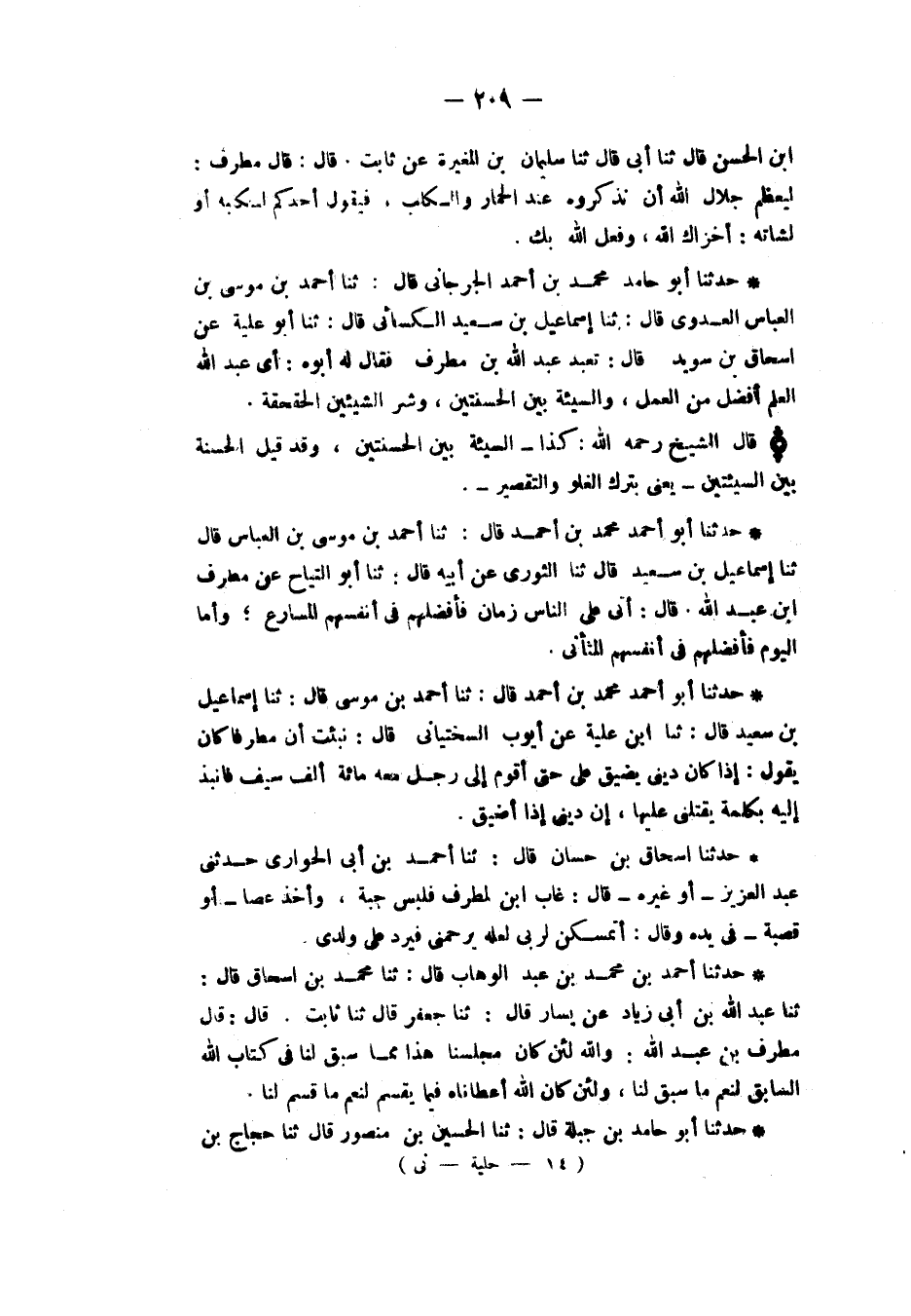 حَدَّثَنَا أَبُو حَامِدٍ مُحَمَّدُ بْنُ أَحْمَدَ الْجُرْجَانِيُّ، قَالَ: ثنا أَحْمَدُ بْنُ مُوسَى بْنِ الْعَبَّاسِ الْعَدَوِيُّ، قَالَ: ثنا إِسْمَاعِيلُ بْنُ سَعِيدٍ الْكِسَائِيُّ، قَالَ: ثنا ابْنُ عُلَيَّةَ، عَنْ إِسْحَاقَ بْنِ سُوَيْدٍ، قَالَ: تَعَبَّدَ عَبْدُ اللهِ بْنُ مُطَرِّفٍ فَقَالَ لَهُ أَبُوهُ: أَيْ عَبْدَ اللهِ «§الْعِلْمُ أَفْضَلُ مِنَ الْعَمَلِ، وَالسَّيِّئَةُ بَيْنَ الْحَسَنَتَيْنِ، وَشَرُّ الشَّيْئَيْنِ الْحَقْحَقَةُ» قَالَ الشَّيْخُ رَحِمَهُ اللهُ: كَذَا السَّيِّئَةُ بَيْنَ الْحَسَنَتَيْنَ وَقَدْ قِيلَ: الْحَسَنَةُ بَيْنَ السَّيِّئَتَيْنِ يَعْنِي بِتَرْكِ الْغُلُوِّ وَالتَّقْصِيرِ "