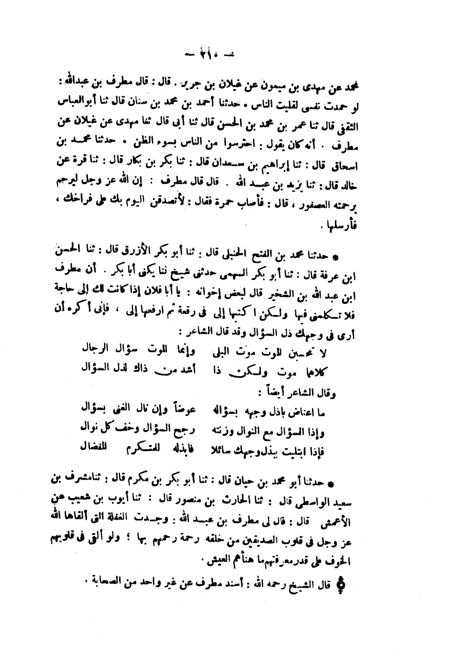 حَدَّثَنَا مُحَمَّدُ بْنُ الْفَتْحِ الْحَنْبَلِيُّ، قَالَ: ثنا أَبُو بَكْرٍ الْأَزْرَقُ، قَالَ: ثنا الْحَسَنُ بْنُ عَرَفَةَ، قَالَ: ثنا أَبُو بَكْرٍ السَّهْمِيُّ، حَدَّثَنِي شَيْخٌ لَنَا يُكْنَى أَبَا بَكْرٍ، أَنَّ مُطَرِّفَ بْنَ عَبْدِ اللهِ بْنِ الشِّخِّيرِ، قَالَ لِبَعْضِ إِخْوَانِهِ: " يَا أَبَا فُلَانٍ، §إِذَا كَانَتْ لَكَ إِلَيَّ حَاجَةٌ فَلَا تُكَلِّمْنِي فِيهَا وَلَكِنِ اكْتُبْهَا إِلَيَّ فِي رُقْعَةٍ ثُمَّ ارْفَعْهَا إِلَيَّ، فَإِنِّي أَكْرَهُ أَنْ أَرَى فِي وَجْهِكِ ذُلَّ السُّؤَالِ، وَقَدْ قَالَ الشَّاعِرُ:
