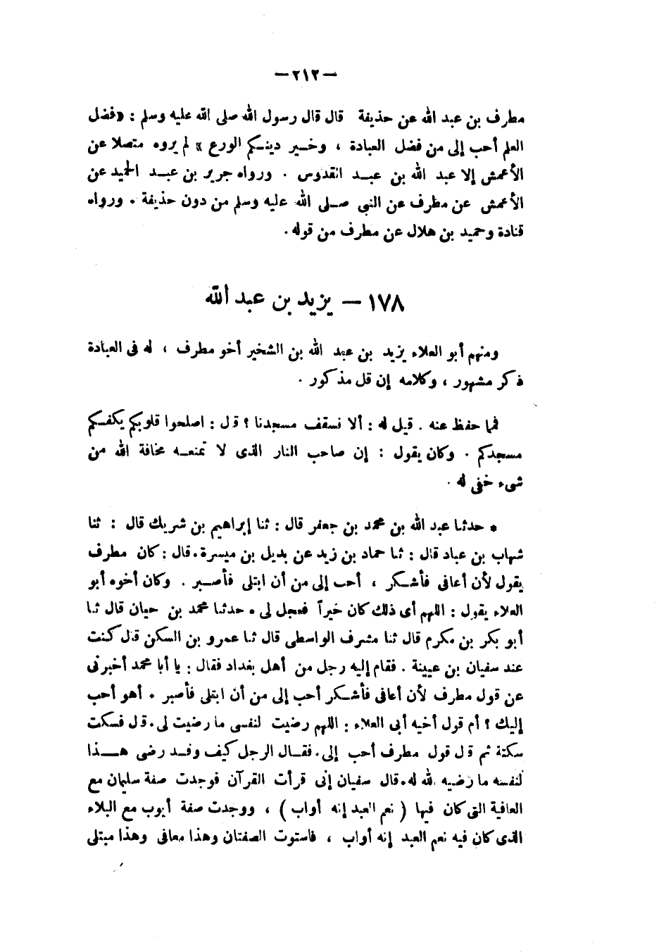 §يَزِيدُ بْنُ عَبْدِ اللهِ وَمِنْهُمْ أَبُو الْعَلَاءِ يَزِيدُ بْنُ عَبْدِ اللهِ بْنِ الشِّخِّيرِ أَخُو مُطَرِّفٍ لَهُ فِي الْعِبَادَةِ ذِكْرٌ مَشْهُورٌ وَكَلَامُهُ إِنْ قَلَّ مَذْكُورٌ فَمِمَّا حُفِظَ عَنْهُ قِيلَ لَهُ: " أَلَا نُسَقِّفُ مَسْجِدَنَا قَالَ: أَصْلِحُوا قُلُوبَكُمْ يَكْفِكُمْ مَسْجِدَكُمْ " وَكَانَ يَقُولُ: «إِنَّ صَاحِبَ النَّارِ الَّذِي لَا تَمْنَعُهُ مَخَافَةُ اللهِ مِنْ شَيْءٍ خَفِي لَهُ»