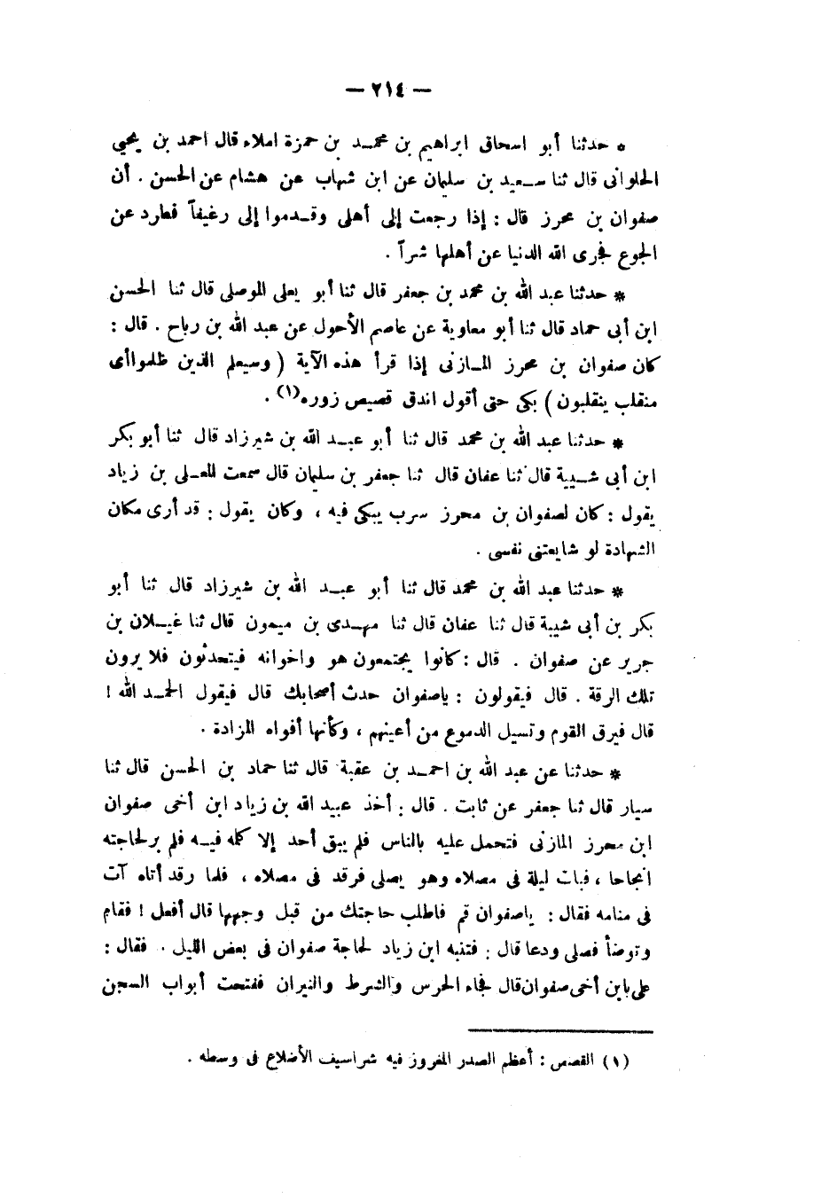 حَدَّثَنَا عَبْدُ اللهِ بْنُ مُحَمَّدٍ، قَالَ: ثنا أَبُو عَبْدِ اللهِ بْنُ شِيرْزَادَ، قَالَ: ثنا أَبُو بَكْرِ بْنُ أَبِي شَيْبَةَ، قَالَ: ثنا عَفَّانُ، قَالَ: ثنا مَهْدِيُّ بْنُ مَيْمُونٍ، قَالَ: ثنا غَيْلَانُ بْنُ جَرِيرٍ، عَنْ صَفْوَانَ، قَالَ: كَانُوا يَجْتَمِعُونَ هُوَ وَإِخْوَانُهُ فَيَتَحَدَّثُونَ فَلَا يَرَوْنَ تِلْكَ الرِّقَةَ قَالَ: يَا صَفْوَانُ حَدِّثْ أَصْحَابَكَ قَالَ: §فَيَقُولُ: «الْحَمْدُ لِلَّهِ» قَالَ: فَيَرِقُّ الْقَوْمُ وَتَسِيلُ الدُّمُوعُ مِنْ أَعْيُنِهِمْ وَكَأَنَّهَا أَفْوَاهُ الْمَزَادَةِ