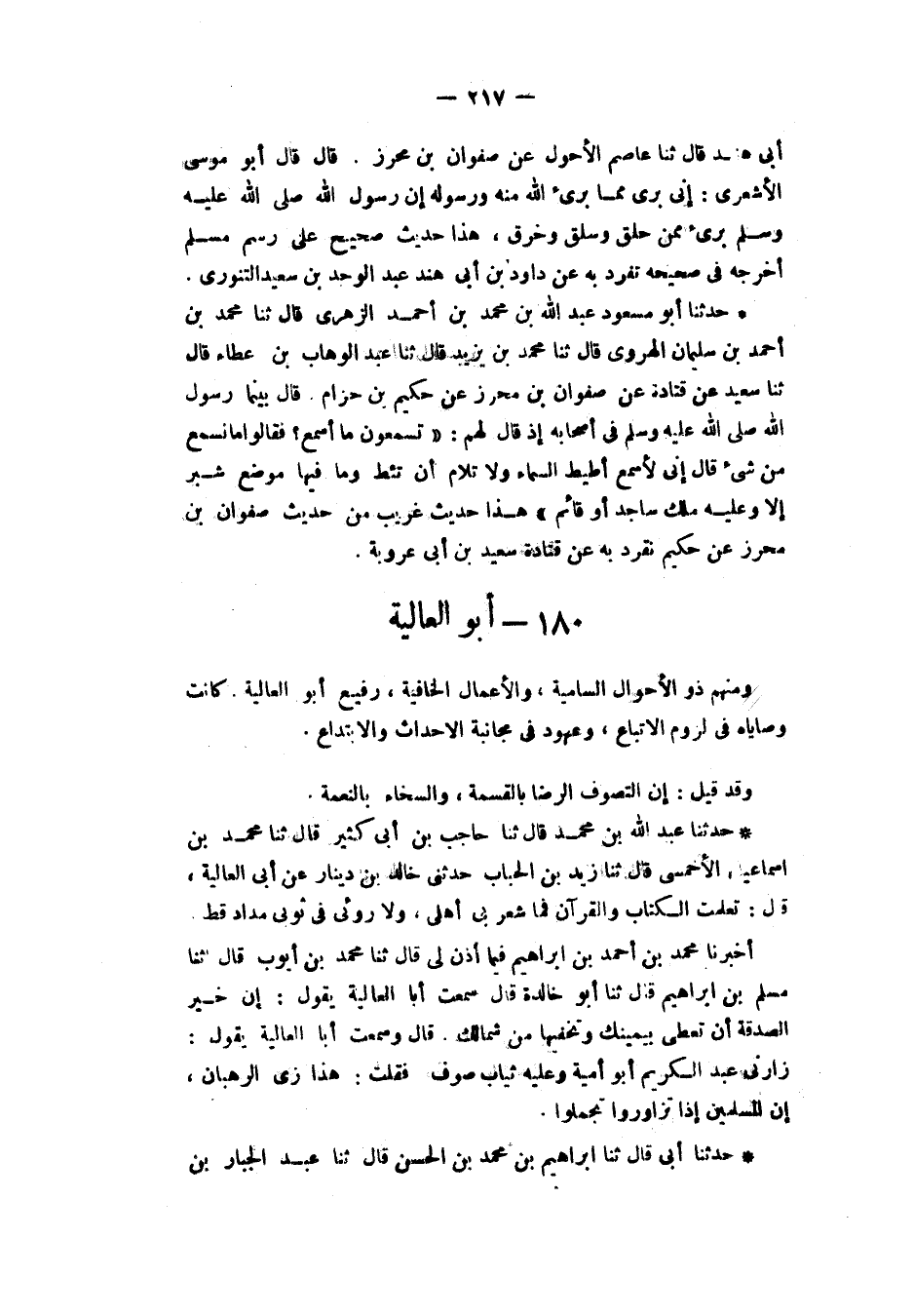 §أَبُو الْعَالِيَةِ وَمِنْهُمْ ذُو الْأَحْوَالِ السَّامِيَةِ وَالْأَعْمَالِ الْخَافِيَةِ رُفَيْعٌ أَبُو الْعَالِيَةِ كَانَتْ وَصَايَاهُ فِي لُزُومِ الِاتِّبِاعِ، وَعُهُودُهُ فِي مُجَانَبَةِ الْإِحْدِاثِ وَالِابْتِدَاعِ، وَقَدْ قِيلَ: إِنَّ التَّصَوُّفَ الرِّضَا بِالْقِسْمَةِ وَالسَّخَاءُ بِالنِّعْمَةِ