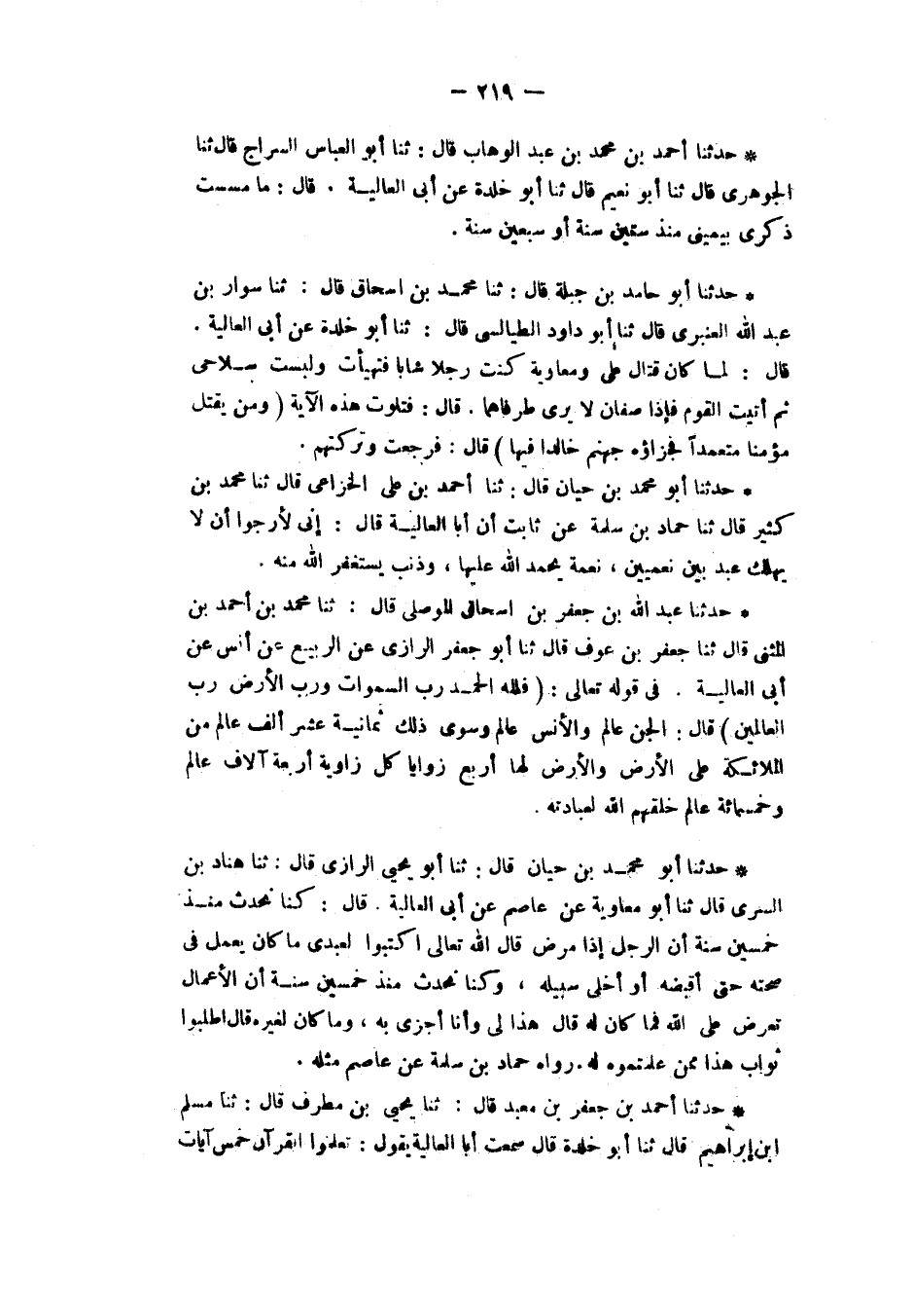حَدَّثَنَا أَحْمَدُ بْنُ مُحَمَّدِ بْنِ عَبْدِ الْوَهَّابِ، قَالَ: ثنا أَبُو الْعَبَّاسِ السَّرَّاجُ، قَالَ: ثنا الْجَوْهَرِيُّ، قَالَ: ثنا أَبُو نُعَيْمٍ، قَالَ: ثنا أَبُو خَلْدَةَ، عَنْ أَبِي الْعَالِيَةِ، قَالَ: «§مَا مَسِسْتُ ذَكَرِي بِيَمِينِي مُنْذُ سِتِّينَ سَنَةً أَوْ سَبْعِينَ سَنَةً»