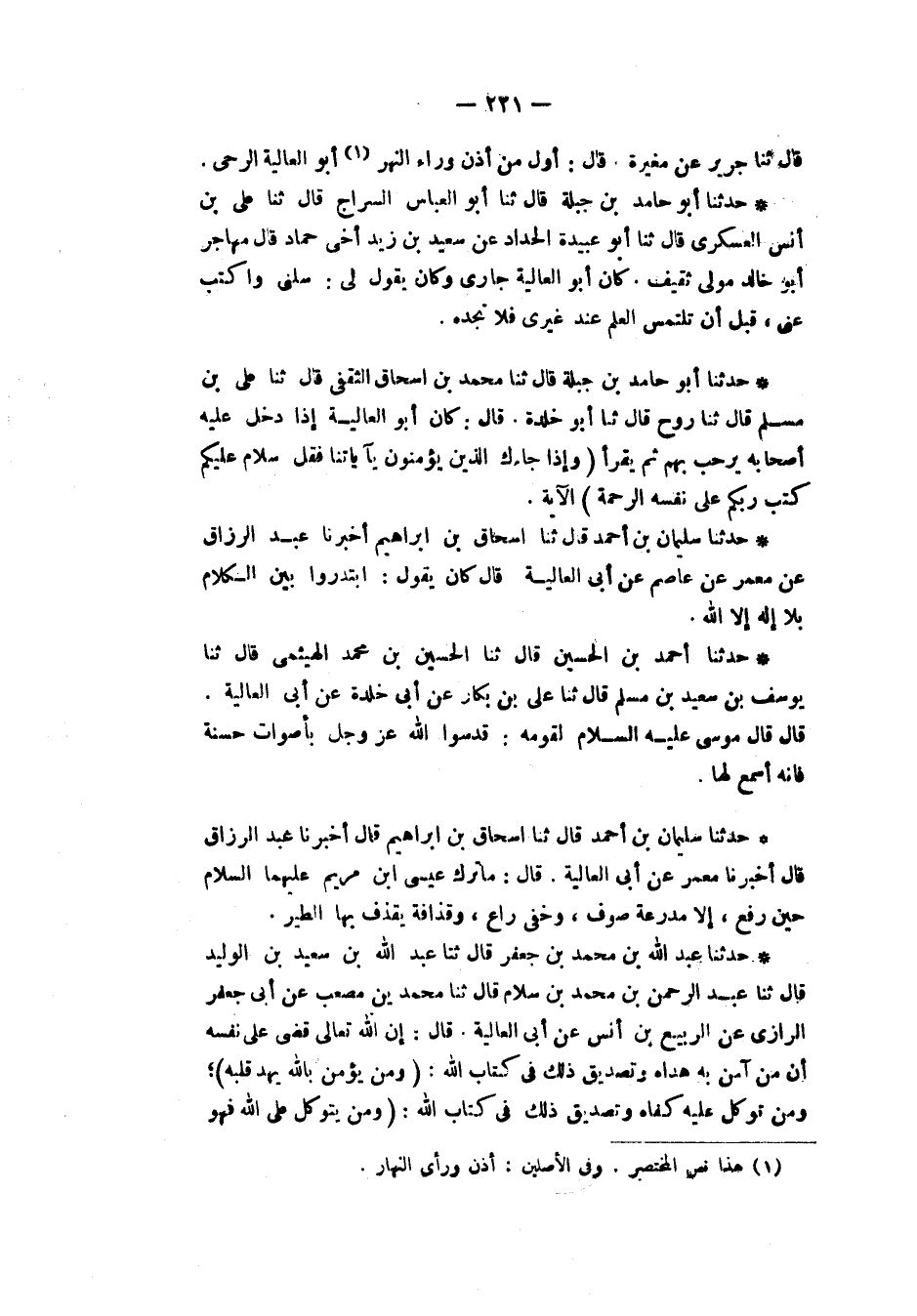 حَدَّثَنَا أَبُو حَامِدِ بْنُ جَبَلَةَ، قَالَ: ثنا أَبُو الْعَبَّاسِ السَّرَّاجُ، قَالَ: ثنا عَلِيُّ بْنُ أَنَسٍ الْعَسْكَرِيُّ، قَالَ: ثنا أَبُو عُبَيْدَةَ الْحَدَّادُ، عَنْ سَعِيدِ بْنِ زَيْدٍ أَخِي حَمَّادٍ قَالَ مُهَاجِرٌ أَبُو خَالِدٍ مَوْلَى ثَقِيفٍ: كَانَ أَبُو الْعَالِيَةِ جَارِي وَكَانَ يَقُولُ لِي: «§سَلْنِي وَاكْتُبْ عَنِّي قَبْلَ أَنْ تَلْتَمِسَ الْعِلْمَ عِنْدَ غَيْرِي فَلَا تَجِدَهُ»