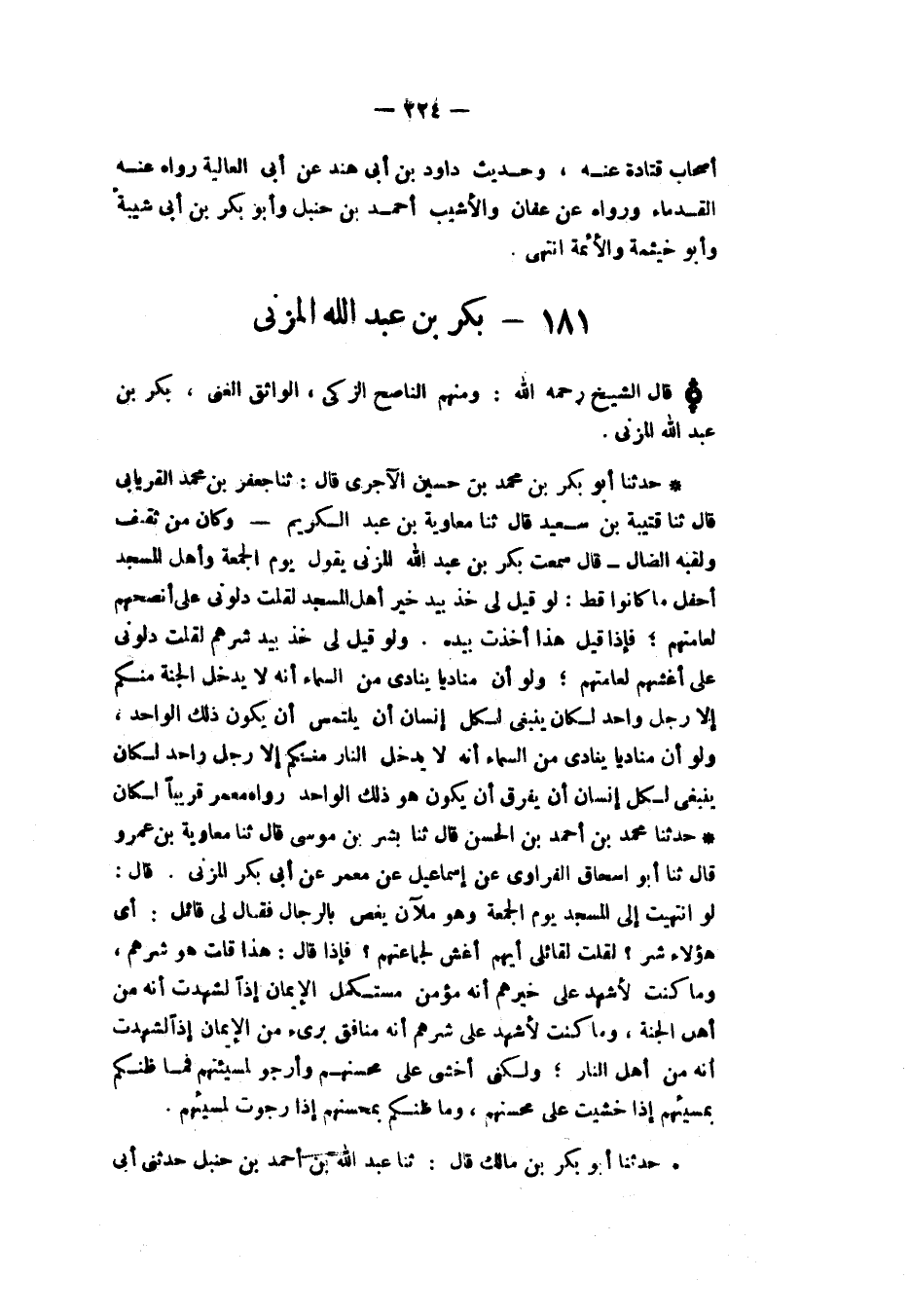 حَدَّثَنَا أَبُو بَكْرِ بْنُ مُحَمَّدِ بْنِ حُسَيْنٍ الْآجُرِّيُّ، قَالَ: ثنا جَعْفَرُ بْنُ مُحَمَّدٍ الْفِرْيَابِيُّ، قَالَ: ثنا قُتَيْبَةُ بْنُ سَعِيدٍ، قَالَ: ثنا مُعَاوِيَةُ بْنُ عَبْدِ الْكَرِيمِ، وَكَانَ، مِنْ ثَقِيفٍ وَلَقَبُهُ الضَّالُّ قَالَ: سَمِعْتُ بَكْرَ بْنَ عَبْدِ اللهِ الْمُزَنِيَّ يَقُولُ يَوْمَ الْجُمُعَةِ وَأَهْلُ الْمَسْجِدِ أَحْفَلُ مَا كَانُوا قَطُّ: " §لَوْ قِيلَ لِي: خُذْ بِيَدِ خَيْرِ أَهْلِ الْمَسْجِدِ لَقُلْتُ: دُلُّونِي عَلَى أَنْصَحِهِمْ لِعَامَّتِهِمْ، فَإِذَا قِيلَ: هَذَا، أَخَذْتَ بِيَدِهِ، وَلَوْ قِيلَ لِي خُذْ بِيَدِ شَرِّهِمْ لَقُلْتُ دُلُّونِي عَلَى أَغَشِّهِمْ لِعَامَّتِهِمْ، وَلَوْ أَنَّ مُنَادِيًا يُنَادِي مِنَ السَّمَاءِ أَنَّهُ لَا يَدْخُلُ الْجَنَّةَ مِنْكُمْ إِلَّا رَجُلٌ وَاحِدٌ، لَكَانَ يَنْبَغِي لِكُلِّ إِنْسَانٍ أَنْ يَلْتَمِسَ أَنْ يَكُونَ هُوَ ذَلِكَ الْوَاحِدَ، وَلَوْ أَنَّ مُنَادِيًا يُنَادِي مِنَ السَّمَاءِ أَنَّهُ لَا يَدْخُلُ النَّارَ مِنْكُمْ إِلَّا رَجُلٌ وَاحِدٌ لَكَانَ يَنْبَغِي لِكُلِّ إِنْسَانٍ أَنْ يَفْرَقَ أَنْ يَكُونَ هُوَ ذَلِكَ الْوَاحِدَ " رَوَاهُ مَعْمَرٌ: قَرِيبًا مِنْهُ