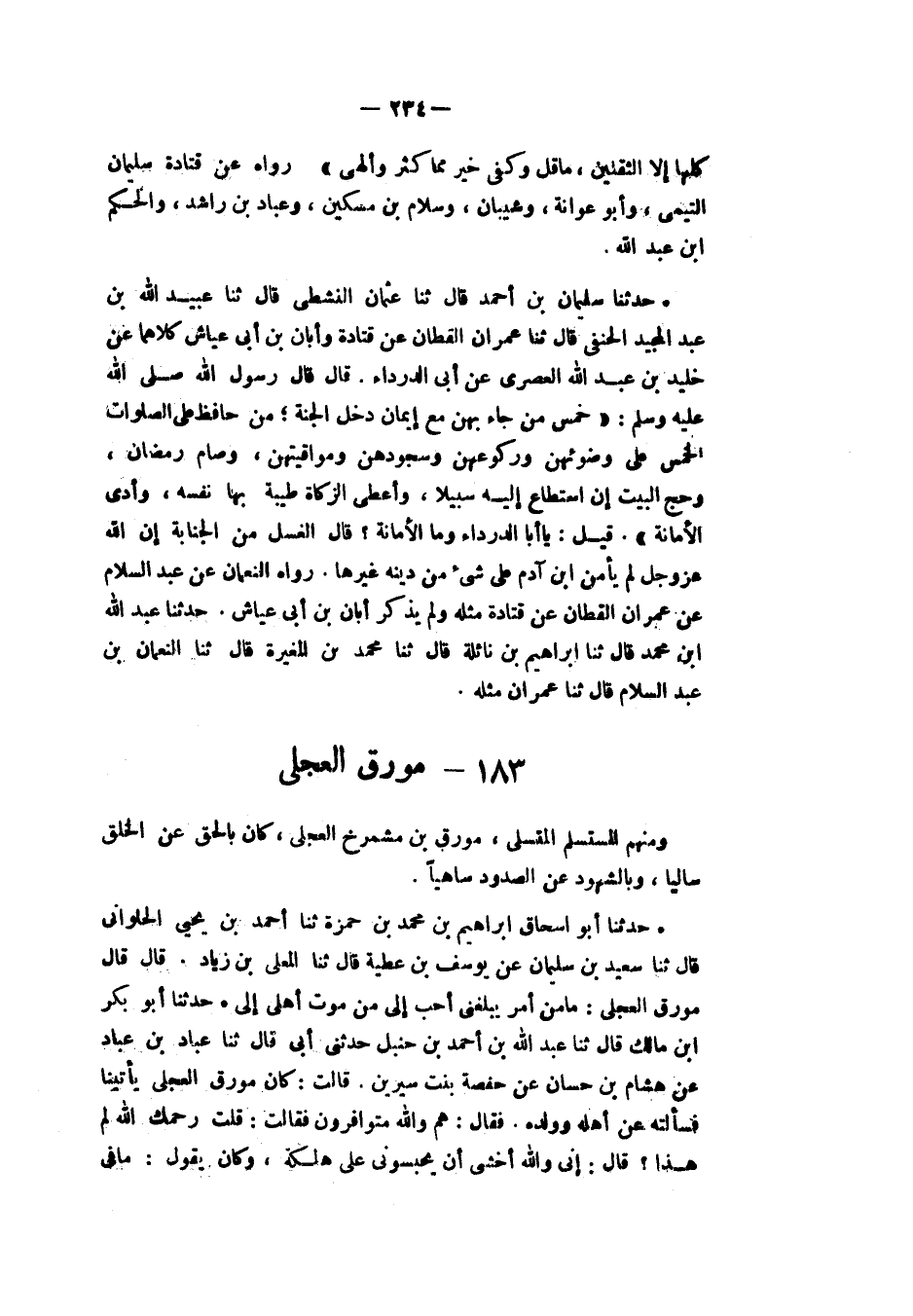 حَدَّثَنَا أَبُو بَكْرِ بْنُ مَالِكٍ، قَالَ: ثنا عَبْدُ اللهِ بْنُ أَحْمَدَ بْنِ حَنْبَلٍ، حَدَّثَنِي أَبِي قَالَ ثَنَا عَبَّادُ بْنُ عَبَّادٍ، عَنْ هِشَامِ بْنِ حَسَّانَ، عَنْ حَفْصَةَ بِنْتِ سِيرِينَ، قَالَتْ: كَانَ مُوَرِّقٌ الْعِجْلِيُّ يَأْتِينَا فَسَأَلْتُهُ عَنْ أَهْلِهِ وَوَلَدِهِ، فَقَالَ: «هُمْ وَاللهِ مُتَوَافِرُونَ» فَقَالَتْ: قُلْتُ: رَحِمَكَ اللهُ لِمَ هَذَا؟ قَالَ: «إِنِّي وَاللهِ §أَخْشَى أَنْ يَحْبِسُونِي عَلَى هَلَكَةٍ»