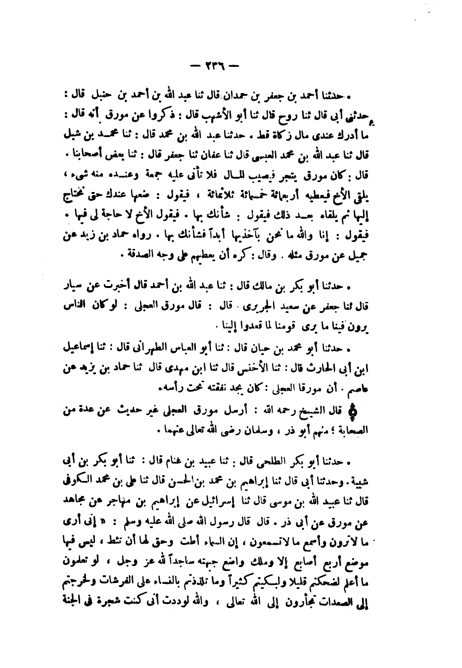 حَدَّثَنَا أَحْمَدُ بْنُ جَعْفَرِ بْنِ حَمْدَانَ، قَالَ: ثنا عَبْدُ اللهِ بْنُ أَحْمَدَ بْنِ حَنْبَلٍ، قَالَ: حَدَّثَنِي أَبِي، ثنا رَوْحٌ، قَالَ: ثنا أَبُو الْأَشْهَبِ، قَالَ: ذَكَرُوا عَنْ مُوَرِّقٍ، أَنَّهُ قَالَ: «§مَا أُدْرِكَ عِنْدِي مَالُ زَكَاةٍ قَطُّ»
