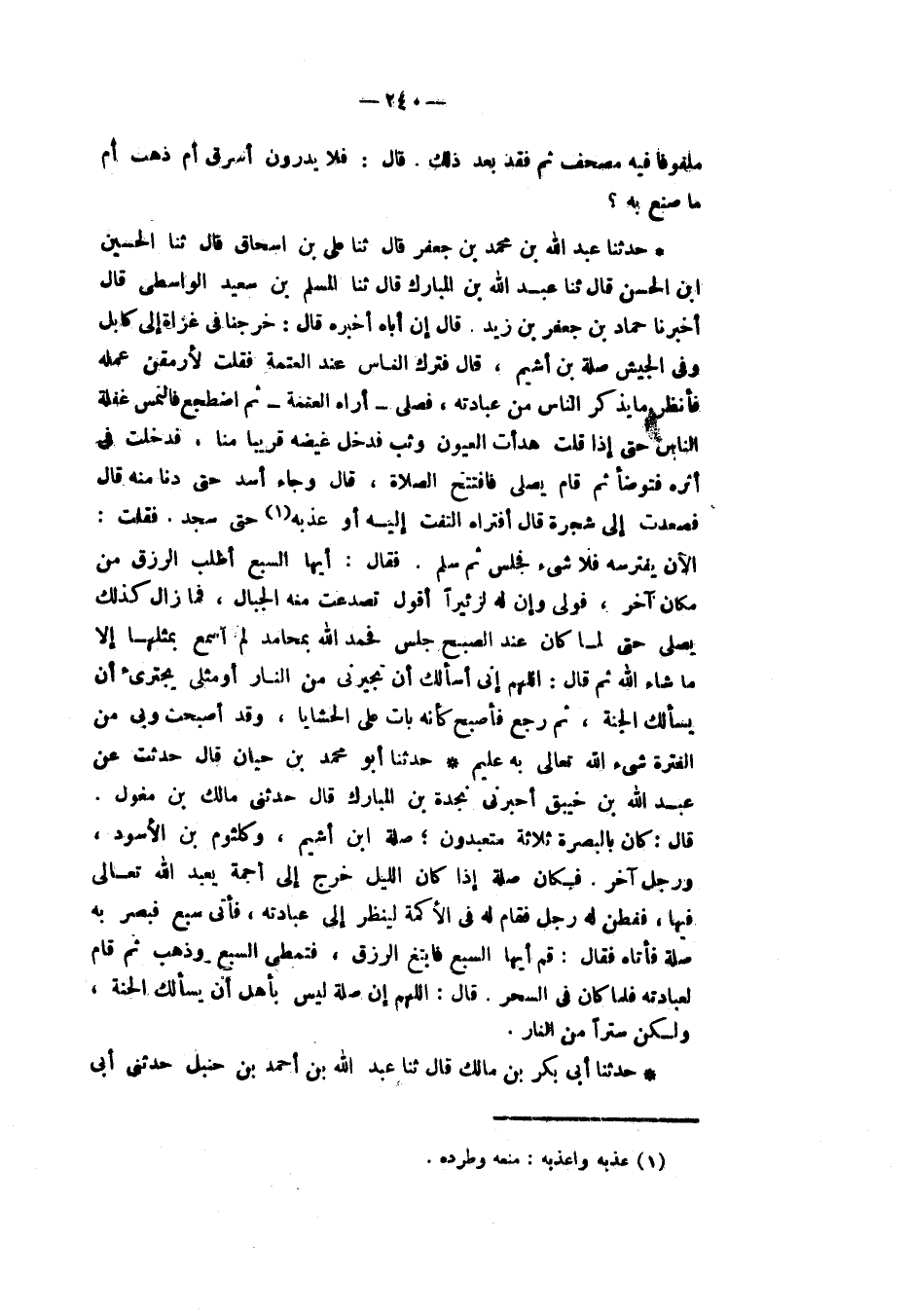 حَدَّثَنَا عَبْدُ اللهِ بْنُ مُحَمَّدِ بْنِ جَعْفَرٍ، قَالَ: ثنا عَلِيُّ بْنُ إِسْحَاقَ، قَالَ: ثنا الْحُسَيْنُ بْنُ الْحَسَنِ، قَالَ: ثنا عَبْدُ اللهِ بْنُ الْمُبَارَكِ، قَالَ: ثنا الْمُسْلِمُ بْنُ سَعِيدٍ الْوَاسِطِيُّ، قَالَ: أَخْبَرَنَا حَمَّادُ بْنُ جَعْفَرِ بْنِ زَيْدٍ، قَالَ: إِنَّ أَبَاهُ أَخْبَرَهُ قَالَ: خَرَجْنَا فِي غَزَاةٍ إِلَى كَابُلَ وَفِي الْجَيْشِ صِلَةُ بْنُ أَشْيَمَ قَالَ: فَتَرَكَ النَّاسَ عِنْدَ الْعَتَمَةِ فَقُلْتُ: لَأَرْمُقَنَّ عَمَلَهُ فَأَنْظُرُ مَا يَذْكُرُ النَّاسُ مِنْ عِبَادَتِهِ فَصَلَّى - أُرَاهُ الْعَتَمَةَ - ثُمَّ اضْطَجَعَ فَالْتَمَسَ غَفْلَةَ النَّاسِ حَتَّى إِذَا قُلْتُ: هَدَأَتِ الْعُيونُ وَثَبَ فَدَخَلَ غَيْضَةً قَرِيبًا مِنِّي فَدَخَلْتُ فِي أَثَرِهِ فَتَوَضَّأَ ثُمَّ قَامَ يُصَلِّي فَافْتَتَحَ الصَّلَاةَ قَالَ: وَجَاءَ أَسَدٌ حَتَّى دَنَا مِنْهُ قَالَ: فَصَعِدْتُ إِلَى شَجَرَةٍ قَالَ: أَفَتُرَاهُ الْتَفَتَ إِلَيْهِ أَوْ عَذَبَهُ، حَتَّى سَجَدَ فَقُلْتُ: الْآنَ يَفْتَرِسُهُ فَلَا شَيْءَ فَجَلَسَ ثُمَّ سَلَّمَ فَقَالَ: «أَيُّهَا السَّبُعُ اطْلُبِ الرِّزْقَ مِنْ مَكَانٍ آخَرَ» فَوَلَّى وَإِنَّ لَهُ لَزَئِيرًا أَقُولُ تَصَدَّعَتْ مِنْهُ الْجِبَالُ فَمَا زَالَ كَذَلِكَ يُصَلِّي حَتَّى لَمَّا كَانَ عِنْدَ الصُّبْحِ جَلَسَ فَحَمِدَ اللهَ بِمَحَامِدَ لَمْ أَسْمَعْ بِمِثْلِهَا إِلَّا مَا شَاءَ اللهُ ثُمَّ قَالَ: «§اللهُمَّ إِنِّي أَسْأَلُكَ أَنْ تُجِيرَنِيَ مِنَ النَّارِ أَوَ مِثْلِي يَجْتَرِئُ أَنْ يَسْأَلُكَ الْجَنَّةَ» ثُمَّ رَجَعَ فَأَصْبَحَ كَأَنَّهُ بَاتَ عَلَى الْحَشَايَا وَقَدْ أَصْبَحْتُ وَبِي مِنَ الْفَتْرَةِ شَيْءٌ اللهُ تَعَالَى بِهِ عَلِيمٌ