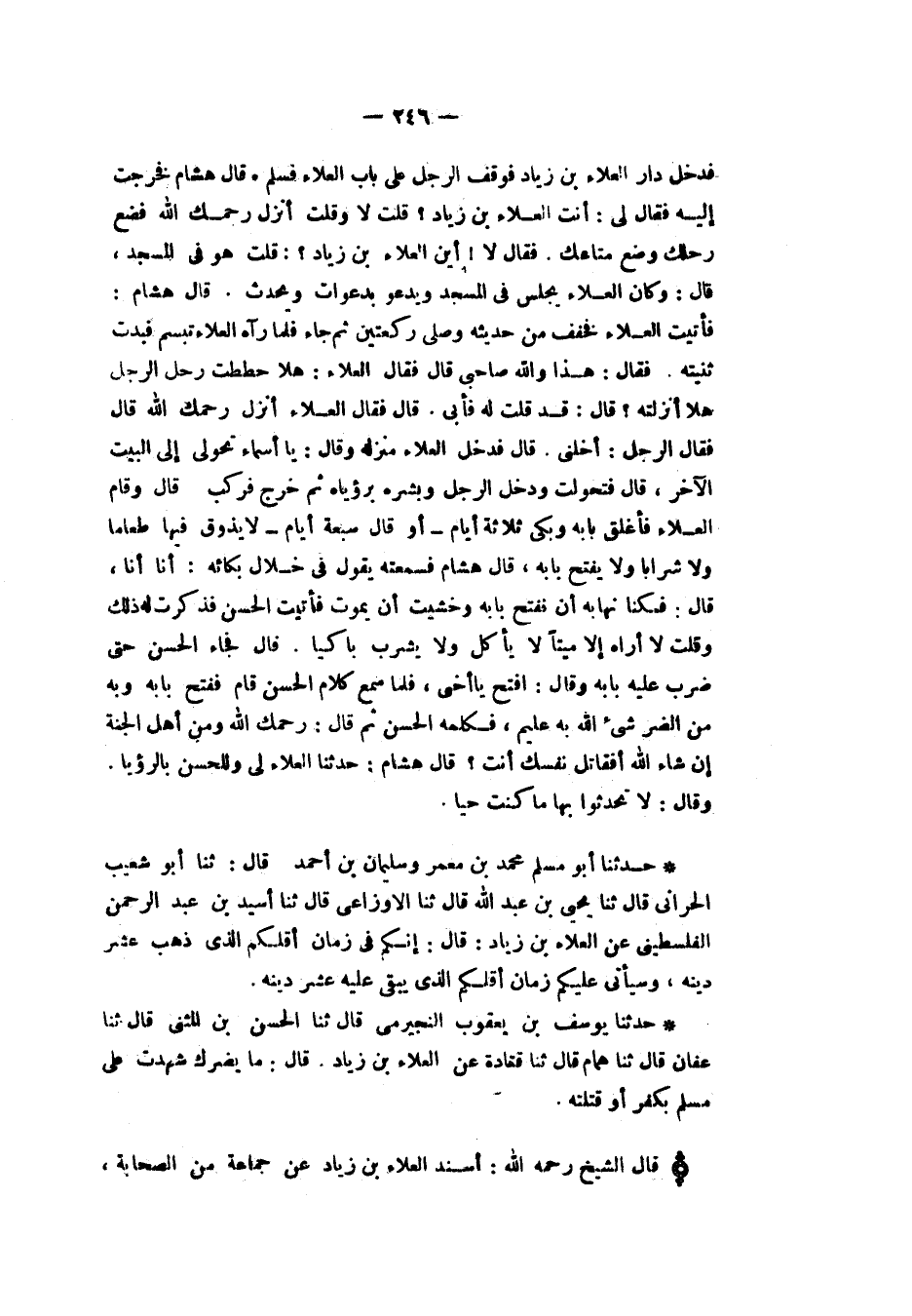 حَدَّثَنَا يُوسُفُ بْنُ يَعْقُوبَ النَّجِيرَمِيُّ، قَالَ: ثنا الْحَسَنُ بْنُ الْمُثَنَّى، قَالَ: ثنا عَفَّانُ، قَالَ: ثنا هَمَّامٌ، قَالَ: ثنا قَتَادَةُ، عَنِ الْعَلَاءِ بْنِ زِيَادٍ، قَالَ: «§مَا يَضُرُّكَ شَهِدْتَ عَلَى مُسْلِمٍ بِكُفْرٍ أَوْ قَتَلْتَهُ» قَالَ الشَّيْخُ رَحِمَهُ اللهُ: أَسْنَدَ الْعَلَاءُ بْنُ زِيَادٍ عَنْ جَمَاعَةٍ مِنَ الصَّحَابَةِ -[247]- عَنْ عِمْرَانَ بْنِ حُصَيْنٍ، وَأَبِي هُرَيْرَةَ وَأَرْسَلَ عَنْ مُعَاذِ بْنِ جَبَلٍ، وَأَبِي ذَرٍّ، وَعُبَادَةَ بْنِ الصَّامِتِ رَضِيَ اللهُ تَعَالَى عَنْهُمْ