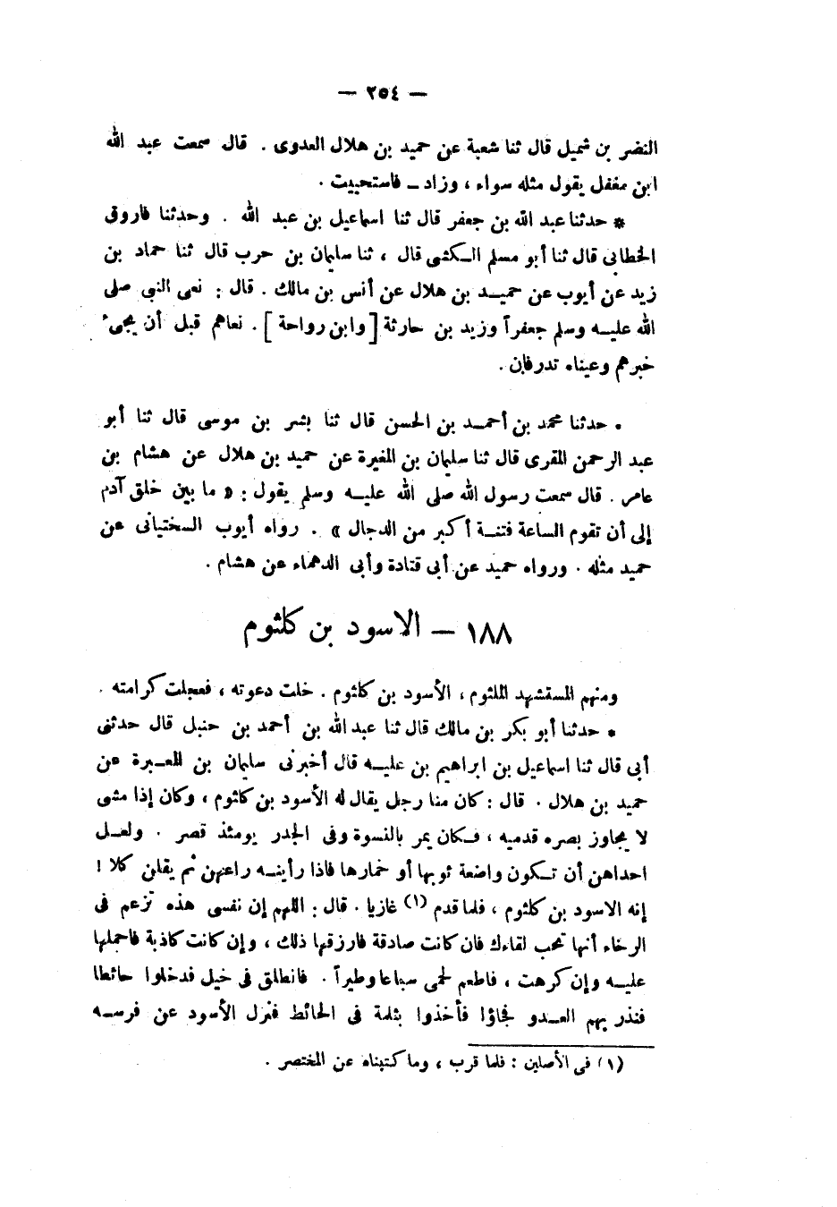 حَدَّثَنَا أَبُو بَكْرِ بْنُ مَالِكٍ، قَالَ: ثنا عَبْدُ اللهِ بْنُ أَحْمَدَ بْنِ حَنْبَلٍ، قَالَ: حَدَّثَنِي أَبِي قَالَ: ثنا إِسْمَاعِيلُ بْنُ إِبْرَاهِيمَ ابْنِ عُلَيَّةَ، قَالَ: أَخْبَرَنِي سُلَيْمَانُ بْنُ الْمُغِيرَةِ، عَنْ حُمَيْدِ بْنِ هِلَالٍ، قَالَ: كَانَ مِنَّا رَجُلٌ يُقَالُ لَهُ الْأَسْوَدُ بْنُ كُلْثُومٍ، وَكَانَ إِذَا مَشَى لَا يُجَاوِزُ بَصَرُهُ قَدَمَيْهِ فَكَانَ يَمُرُّ بِالنِّسْوَةِ وَفِي الْجُدُرِ يَوْمَئِذٍ قَصْرٌ وَلَعَلَّ إِحْدَاهُنَّ أَنْ تَكُونَ وَاضِعَةً ثَوْبَهَا أَوْ خِمَارَهَا فَإِذَا رَأَيْنَهُ رَاعَهُنَّ ثُمَّ يَقُلْنَ كَلَّا إِنَّهُ الْأَسْوَدُ بْنُ كُلْثُومٍ فَلَمَّا قَدِمَ غَازِيًا قَالَ: «§اللهُمَّ إِنَّ نَفْسِي هَذِهِ تَزْعُمُ فِي الرَّخَاءِ أَنَّهَا تُحِبُّ لِقَاءَكَ، فَإِنْ كَانَتْ صَادِقَةً فَارْزُقْهَا ذَلِكَ، وَإِنْ كَانَتْ كَاذِبَةً فَاحْمِلْهَا عَلَيْهِ وَإِنْ كَرِهَتْ فَأَطْعِمْ لَحْمِي سِبَاعًا وَطَيْرًا»، فَانْطَلَقَ فِي خَيْلٍ فَدَخَلُوا حَائِطًا فَنَذَرَ بِهِمُ الْعَدُوُّ فَجَاءُوا فَأَخَذُوا بِثُلْمَةٍ فِي الْحَائِطِ فَنَزَلَ الْأَسْوَدُ عَنْ فَرَسِهِ -[255]- فَضَرَبَهَا حَتَّى غَارَتْ فَخَرَجَ فَأَتَى الْمَاءَ فَتَوَضَّأَ ثُمَّ صَلَّى قَالَ: يَقُولُ الْعَجَمُ: هَكَذَا اسْتِسْلَامُ الْعَرَبِ إِذَا اسْتَسْلَمُوا، ثُمَّ تَقَدَّمَ فَقَاتَلَ حَتَّى قُتِلَ قَالَ: فَمَرَّ عُظْمُ الْجَيْشِ بَعْدَ ذَلِكَ بِذَلِكَ الْحَائِطِ فَقِيلَ لِأَخِيهِ: لَوْ دَخَلْتَ فَنَظَرْتَ مَا بَقِيَ مِنْ عِظَامِ أَخِيكَ وَلَحْمِهِ قَالَ: لَا، دَعَا أَخِي بِدَعَوَاتٍ فَاسْتَجيبتُ لَهُ فَلَسْتُ أَعْرِضُ فِي شَيْءٍ مِنْ ذَلِكَ