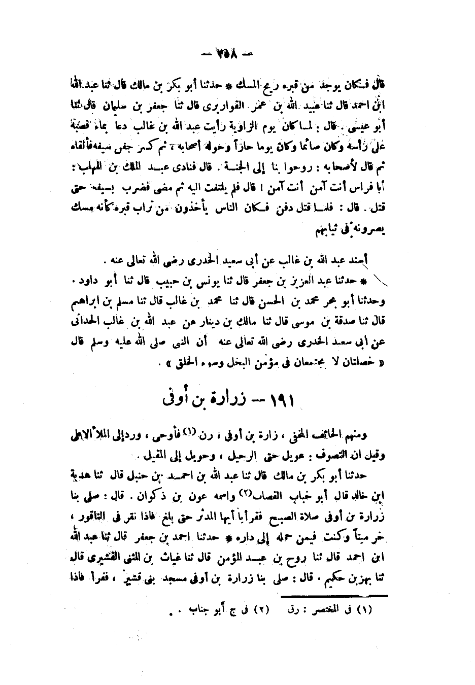 §زُرَارَةُ بْنُ أَوْفَى وَمِنْهُمُ الْخَائِفُ الْمَخْفِيُّ زُرَارَةُ بْنُ أَوْفَى رَقَّ فَأَوْحَى وَرُدَّ إِلَى الْمَلَأِ الْأَعْلَى وَقِيلَ: إِنَّ التَّصَوُّفَ عَوِيلٌ حَتَّى الرَّحِيلِ وَحَوِيلٌ إِلَى الْمَقِيلِ