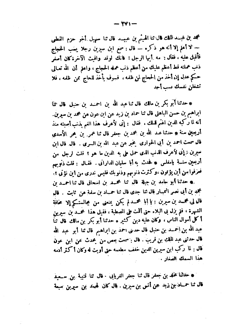 حَدَّثَنَا أَبُو بَكْرِ بْنُ مَالِكٍ، قَالَ: ثنا عَبْدُ اللهِ بْنُ أَحْمَدَ بْنِ حَنْبَلٍ، قَالَ: ثنا إِبْرَاهِيمُ بْنُ حَسَنٍ الْبَاهِلِيُّ، قَالَ: ثنا حَمَّادُ بْنُ زَيْدٍ، عَنِ ابْنِ عَوْنٍ، عَنْ مُحَمَّدِ بْنِ سِيرِينَ، أَنَّهُ لَمَّا رَكِبَهُ الدَّيْنُ اغْتَمَّ لِذَلِكَ فَقَالَ: «§إِنِّي لَأَعْرِفُ هَذَا الْغَمَّ بِذَنْبٍ أَصَبْتُهُ مُنْذُ أَرْبَعِينَ سَنَةً»