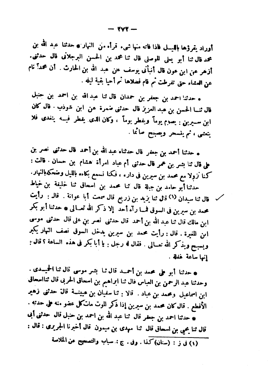 حَدَّثَنَا أَحْمَدُ بْنُ جَعْفَرٍ، قَالَ: حَدَّثَنَاهُ عَبْدُ اللهِ بْنُ أَحْمَدَ، قَالَ: حَدَّثَنِي نَصْرُ بْنُ عَلِيٍّ، قَالَ: ثنا بِشْرُ بْنُ عُمَرَ، قَالَ: حَدَّثَتْنِي أُمُّ عَبَّادٍ، امْرَأَةُ هِشَامِ بْنِ حَسَّانَ قَالَتْ: «كُنَّا نُزُولًا مَعَ مُحَمَّدِ بْنِ سِيرِينَ فِي دَارِهِ فَكُنَّا §نَسْمَعُ بُكَاءَهُ بِاللَّيْلِ وَضَحِكَهُ بِالنَّهَارِ»