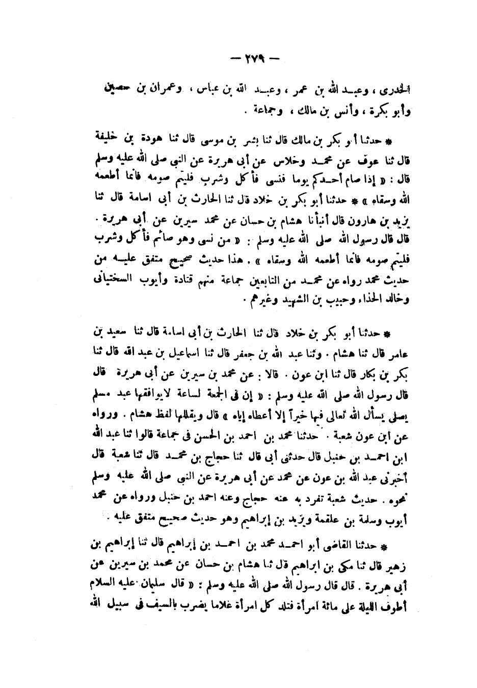 حَدَّثَنَا أَبُو بَكْرِ بْنُ خَلَّادٍ، قَالَ: ثَنَا الْحَارِثُ بْنُ أَبِي أُسَامَةَ، قَالَ: ثَنَا سَعِيدُ بْنُ عَامِرٍ قَالَ: ثنا هِشَامُ، وَثَنَا عَبْدُ اللهِ بْنُ جَعْفَرٍ قَالَ: ثَنَا إِسْمَاعِيلُ بْنُ عَبْدِ اللهِ قَالَ ثَنَا بَكْرُ بْنِ بَكَّارٍ قَالَ: ثَنَا ابْنُ عَوْنٍ قَالَا: عَنْ مُحَمَّدِ بْنِ سِيرِينَ، عَنْ أَبِي هُرَيْرَةَ، قَالَ: قَالَ رَسُولُ اللهِ صَلَّى اللهُ عَلَيْهِ وَسَلَّمَ: «§إِنَّ فِي الْجُمُعَةِ لَسَاعَةً لَا يُوَافِقُهَا عَبْدٌ مُسْلِمٌ يُصَلِّي يَسْأَلُ اللهَ تَعَالَى فِيهَا خَيْرًا إِلَّا أَعْطَاهُ إِيَّاهُ» قَالَ: وَيُقَلِّلُهَا لَفْظُ هِشَامٍ رَوَاهُ عَنِ ابْنِ عَوْنٍ، شُعْبَةُ حَدَّثَنَا مُحَمَّدُ بْنُ أَحْمَدَ بْنِ الْحَسَنِ فِي جَمَاعَةٍ قَالُوا: ثنا عَبْدُ اللهِ بْنُ أَحْمَدَ بْنِ حَنْبَلٍ، قَالَ: حَدَّثَنِي أَبِي، قَالَ: ثنا حَجَّاجُ بْنُ مُحَمَّدٍ، قَالَ: ثنا شُعْبَةُ، قَالَ: أَخْبَرَنِي عَبْدُ اللهِ بْنُ عَوْنٍ، عَنْ مُحَمَّدٍ، عَنْ أَبِي هُرَيْرَةَ، عَنِ النَّبِيِّ صَلَّى اللهُ عَلَيْهِ وَسَلَّمَ نَحْوَهُ حَدِيثُ شُعْبَةَ تَفَرَّدَ بِهِ عَنْهُ حَجَّاجٍ، وَعَنْهُ أَحْمَدُ بْنُ حَنْبَلٍ، وَرَوَاهُ عَنْ مُحَمَّدٍ، أَيُّوبُ، وَسَلَمَةُ بْنُ عَلْقَمَةَ، وَيَزِيدُ بْنُ إِبْرَاهِيمَ وَهُوَ حَدِيثٌ صَحِيحٌ مُتَّفَقٌ عَلَيْهِ