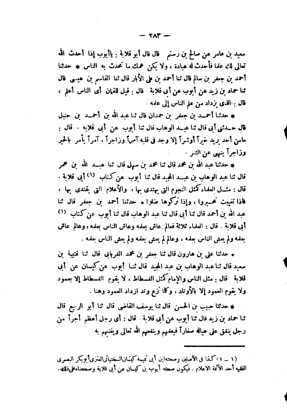 حَدَّثَنَا أَحْمَدُ بْنُ جَعْفَرٍ، قَالَ: ثنا عَبْدُ اللهِ بْنُ أَحْمَدَ، قَالَ: ثنا أَبِي قَالَ: ثنا عَبْدُ الْوَهَّابِ، قَالَ: ثنا أَيُّوبُ، عَنْ كِتَابِ أَبِي قِلَابَةَ، قَالَ: " §الْعُلَمَاءُ ثَلَاثَةٌ: فَعَالِمٌ عَاشَ بِعِلْمِهِ وَعَاشَ النَّاسُ بِعِلْمِهِ، وَعَالِمٌ عَاشَ بِعِلْمِهِ وَلَمْ يَعِشِ النَّاسُ بِعِلْمِهِ، وَعَالِمٌ لَمْ يَعِشْ بِعِلْمِهِ وَلَمْ يَعِشِ النَّاسُ بِعِلْمِهِ "
