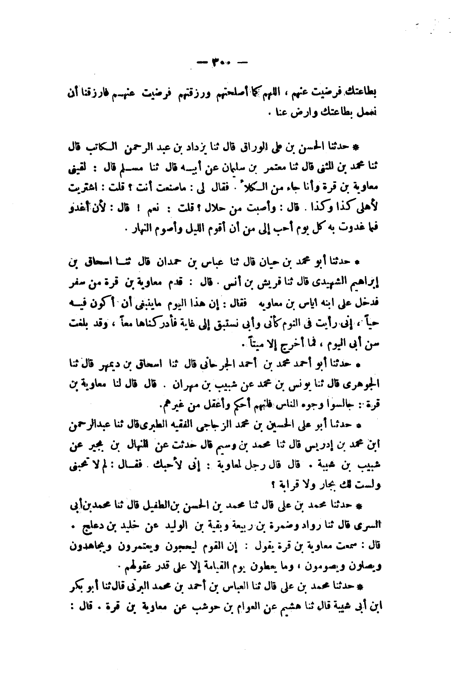 حَدَّثَنَا مُحَمَّدُ بْنُ عَلِيٍّ، قَالَ: ثنا الْعَبَّاسُ بْنُ أَحْمَدَ بْنِ مُحَمَّدٍ الْبَرْتِيُّ، قَالَ: ثنا أَبُو بَكْرِ بْنُ أَبِي شَيْبَةَ، قَالَ: ثنا هُشَيْمٌ، عَنِ الْعَوَّامِ بْنِ حَوْشَبٍ، عَنْ مُعَاوِيَةَ بْنِ قُرَّةَ، قَالَ: -[301]- كَانَ يَقُولُ: «§الْخُصُومَاتُ فِي الدِّينِ لَا تُحْبِطُ الْأَعْمَالَ»