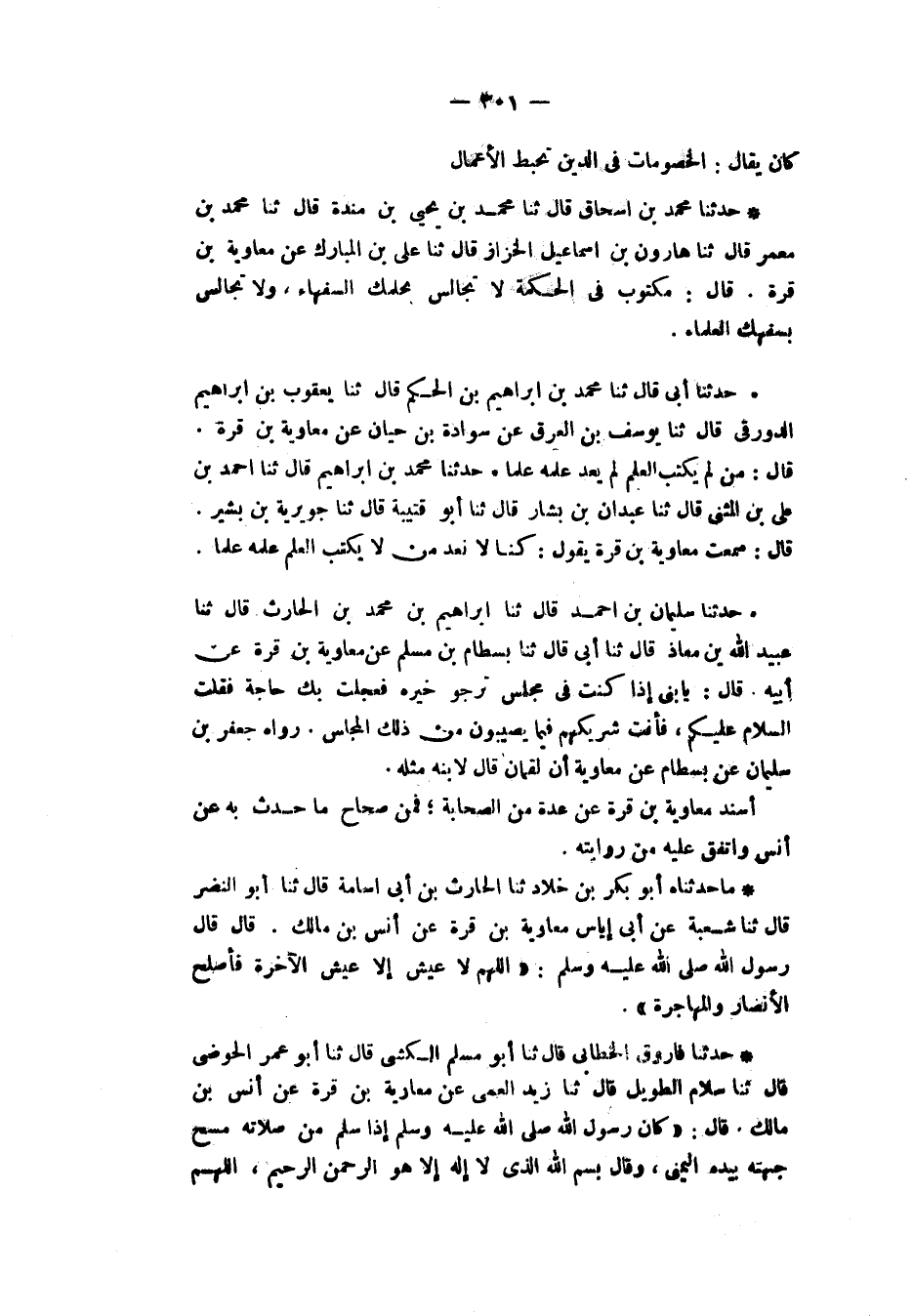 حَدَّثَنَا مُحَمَّدُ بْنُ إِبْرَاهِيمَ، قَالَ: ثنا أَحْمَدُ بْنُ عَلِيِّ بْنِ الْمُثَنَّى، قَالَ: ثنا عَبْدَانُ بْنُ بَشَّارٍ، قَالَ: ثنا أَبُو قُتَيْبَةَ، قَالَ: ثنا جُوَيْرِيَّةُ بْنُ بَشِيرٍ قَالَ سَمِعْتُ مُعَاوِيَةَ بْنَ قُرَّةَ، يَقُولُ: «§كُنَّا لَا نَعُدُّ مَنْ لَا يَكْتُبُ الْعِلْمَ عِلْمَهُ عِلْمًا»