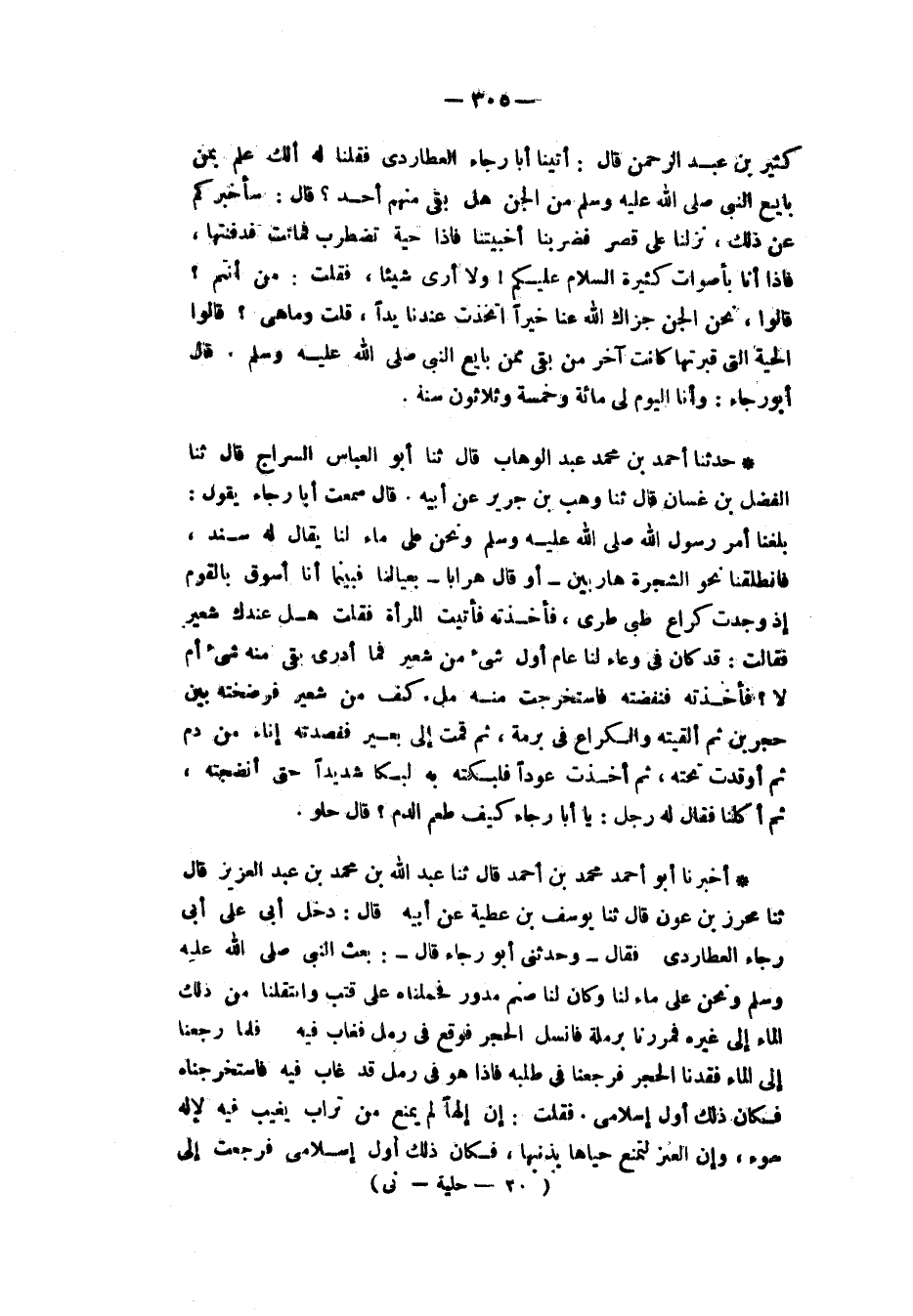 حَدَّثَنَا أَحْمَدُ بْنُ مُحَمَّدِ بْنِ عَبْدِ الْوَهَّابِ، قَالَ: ثنا أَبُو الْعَبَّاسِ السَّرَّاجُ، قَالَ: ثنا الْفَضْلُ بْنُ غَسَّانَ، قَالَ: ثنا وَهْبُ بْنُ جَرِيرٍ، عَنْ أَبِيهِ، قَالَ: سَمِعْتُ أَبَا رَجَاءٍ، يَقُولُ: " §بَلَغَنَا أَمْرُ رَسُولِ اللهِ صَلَّى اللهُ عَلَيْهِ وَسَلَّمَ وَنَحْنُ عَلَى مَاءٍ لَنَا يُقَالُ لَهُ سِنْدٌ فَانْطَلَقْنَا نَحْوَ الشَّجَرَةِ هَارِبِينَ أَوْ قَالَ هِرَابًا بِعِيَالِنَا فَبَيْنَمَا أَنَا أَسُوقُ بِالْقَوْمِ إِذْ وَجَدْتُ كُرَاعَ ظَبْيٍ طَرِيٍّ فَأَخَذْتُهُ فَأَتَيْتُ الْمَرْأَةَ فَقُلْتُ: هَلْ عِنْدَكِ شَعِيرٌ؟ فَقَالَتْ: قَدْ كَانَ فِي وِعَاءٍ لَنَا عَامَ أَوَّلَ شَيْءٌ مِنْ شَعِيرٍ، فَمَا أَدْرِي بَقِيَ مِنْهُ شَيْءٌ أَمْ لَا، فَأَخَذْتُهُ فَنَقَضْتُهُ فَاسْتَخْرَجْتُ مِنْهُ مِلْءَ كَفٍّ مِنْ شَعِيرٍ، فَرَضَخْتُهُ بَيْنَ حَجَرَيْنِ ثُمَّ أَلْقَيْتُهُ وَالْكُرَاعَ فِي بُرْمَةٍ، ثُمَّ قُمْتُ إِلَى بَعِيرٍ فَفَصَدْتُهُ إِنَاءً مِنْ دَمٍ، ثُمَّ أَوْقَدْتُ تَحْتَهُ ثُمَّ أَخَذْتُ عُودًا، فَلَبَكْتُهُ لَبْكًا شَدِيدًا حَتَّى أَنْضَجْتُهُ ثُمَّ أَكَلْنَا " فَقَالَ لَهُ رَجُلٌ: يَا أَبَا رَجَاءٍ كَيْفَ طَعْمُ الدَّمِ؟ قَالَ: «حُلْوٌ»