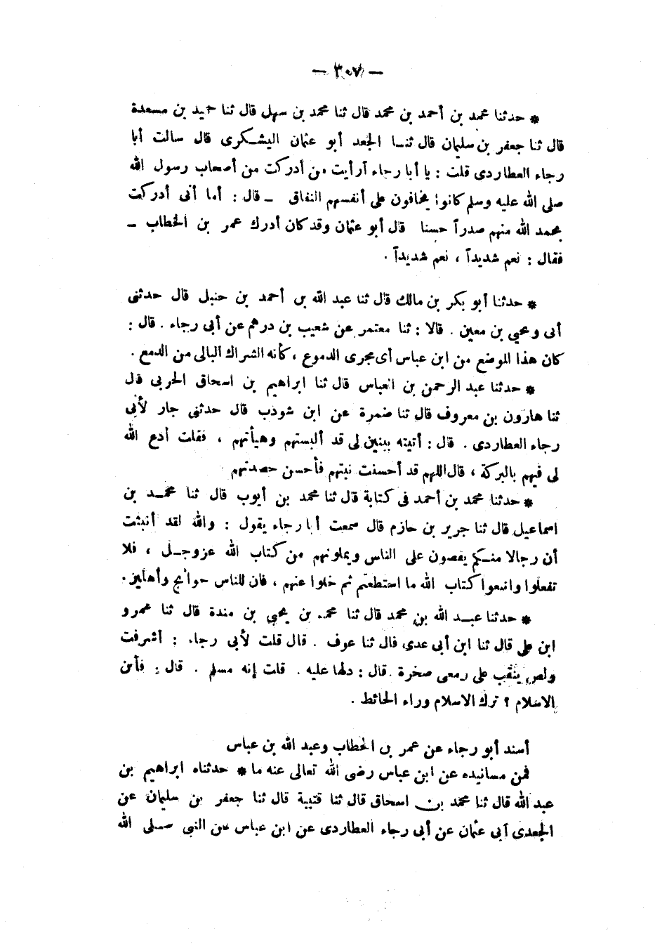 حَدَّثَنَا مُحَمَّدُ بْنُ أَحْمَدَ بْنِ مُحَمَّدٍ، قَالَ: ثنا مُحَمَّدُ بْنُ سَهْلٍ، قَالَ: ثنا حُمَيْدُ بْنُ مَسْعَدَةَ، قَالَ: ثنا جَعْفَرُ بْنُ سُلَيْمَانَ، قَالَ: ثنا الْجَعْدُ أَبُو عُثْمَانَ الْيَشْكُرِيُّ، قَالَ: سَأَلْتُ أَبَا رَجَاءٍ الْعُطَارِدِيَّ قُلْتُ: يَا أَبَا رَجَاءٍ أَرَأَيْتَ مَنْ أَدْرَكْتَ مِنْ أَصْحَابِ رَسُولِ اللهِ صَلَّى اللهُ عَلَيْهِ وَسَلَّمَ كَانُوا يَخَافُونَ عَلَى أَنْفُسِهِمُ النِّفَاقَ؟ قَالَ: «أَمَا إِنِّي §أَدْرَكْتُ بِحَمْدِ اللهِ مِنْهُمْ صَدْرًا حَسَنًا» قَالَ أَبُو عُثْمَانَ: وَقَدْ كَانَ أَدْرَكَ عُمَرَ بْنَ الْخَطَّابِ - فَقَالَ: «نَعَمْ شَدِيدًا، نَعَمْ شَدِيدًا»