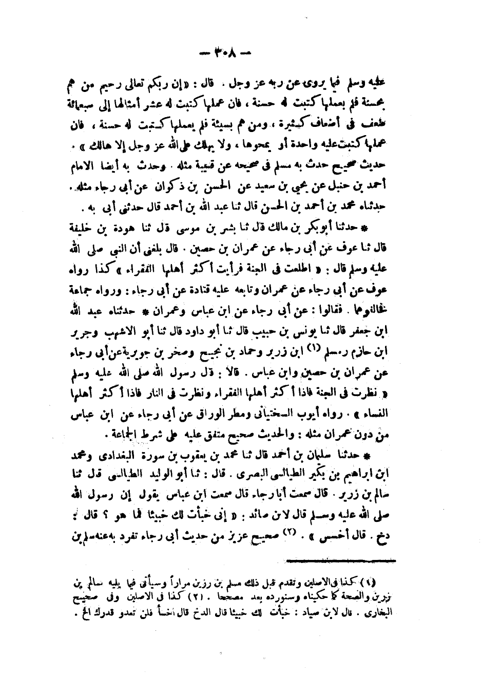حَدَّثَنَاهُ عَبْدُ اللهِ بْنُ جَعْفَرٍ، قَالَ: ثنا يُونُسُ بْنُ حَبِيبٍ، قَالَ: ثنا أَبُو دَاوُدَ، قَالَ: ثنا أَبُو الْأَشْهَبِ، وَجَرِيرُ بْنُ حَازِمٍ، وَسَلْمُ بْنُ زَرِيرٍ، وَحَمَّادُ بْنُ نَجِيحٍ، وَصَخْرُ بْنُ جُوَيْرِيَةَ، عَنْ أَبِي رَجَاءٍ، عَنْ عِمْرَانَ بْنِ حُصَيْنٍ، وَابْنِ عَبَّاسٍ قَالَا: قَالَ رَسُولُ اللهِ صَلَّى اللهُ عَلَيْهِ وَسَلَّمَ: «§نَظَرْتُ فِي الْجَنَّةِ فَإِذَا أَكْثَرُ أَهْلِهَا الْفُقَرَاءُ وَنَظَرْتُ فِي النَّارِ فَإِذَا أَكْثَرُ أَهْلِهَا النِّسَاءُ» رَوَاهُ أَيُّوبُ السَّخْتِيَانِيُّ، وَمَطَرٌ الْوَرَّاقُ، عَنْ أَبِي رَجَاءٍ، عَنِ ابْنِ عَبَّاسٍ، مِنْ دُونِ عِمْرَانَ مِثْلَهُ وَالْحَدِيثُ صَحِيحٌ مُتَّفَقٌ عَلَيْهِ عَلَى شَرْطِ الْجَمَاعَةِ