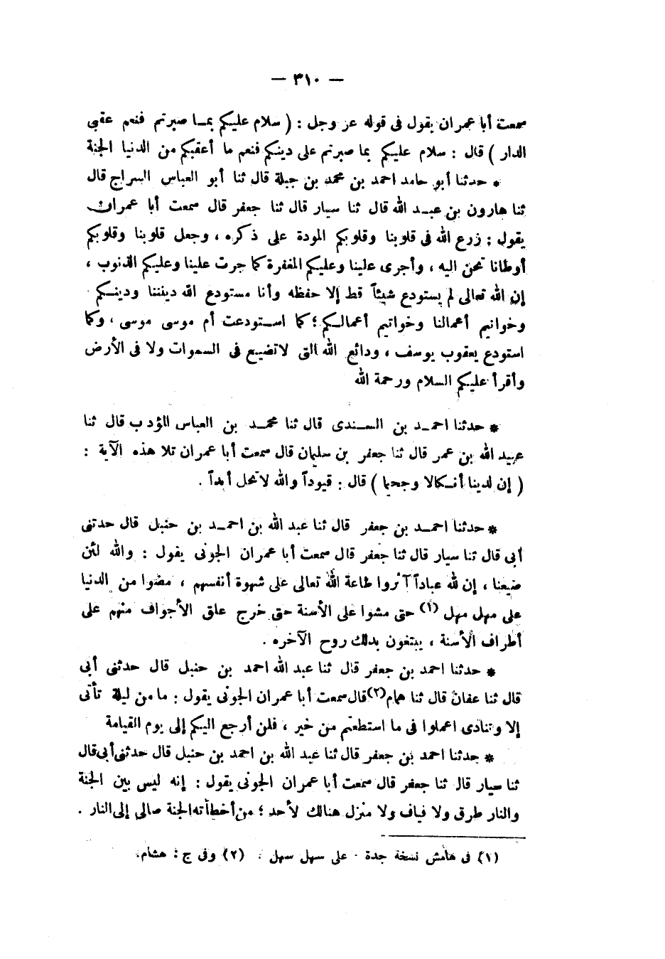 حَدَّثَنَا أَحْمَدُ بْنُ جَعْفَرٍ، قَالَ: ثنا عَبْدُ اللهِ بْنُ أَحْمَدَ بْنِ حَنْبَلٍ، قَالَ: حَدَّثَنِي أَبِي قَالَ: ثنا سَيَّارٌ، قَالَ: ثنا جَعْفَرٌ، قَالَ: سَمِعْتُ أَبَا عِمْرَانَ الْجَوْنِيَّ، يَقُولُ: «إِنَّهُ §لَيْسَ بَيْنَ الْجَنَّةِ وَالنَّارِ طُرُقٌ وَلَا فَيَافٍ وَلَا مَنْزِلَةٌ هُنَالِكَ لِأَحَدٍ مَنْ أَخْطَأَتْهُ الْجَنَّةُ صَارَ إِلَى النَّارِ»