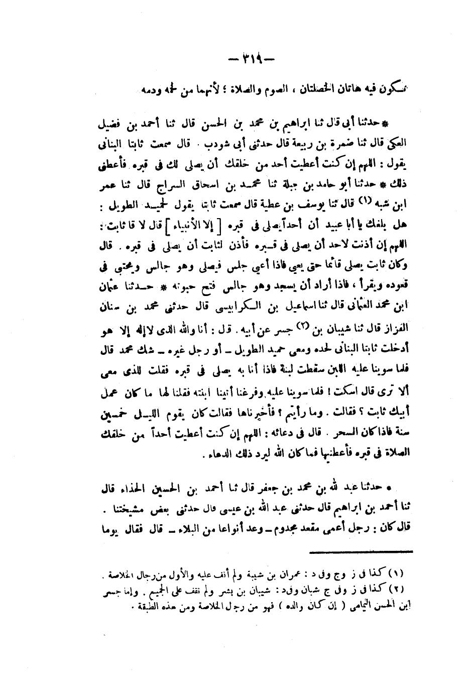 حَدَّثَنَا أَبُو حَامِدِ بْنُ جَبَلَةَ قَالَ: ثنا مُحَمَّدُ بْنُ إِسْحَاقَ السَّرَّاجُ، قَالَ: ثنا عُمَرُ بْنُ شَبَّةَ، قَالَ: ثنا يُوسُفُ بْنُ عَطِيَّةَ، قَالَ: سَمِعْتُ ثَابِتًا، يَقُولُ لِحُمَيْدٍ الطَّوِيلِ: «هَلْ بَلَغَكَ يَا أَبَا عُبَيْدٍ أَنَّ أَحَدًا يُصَلِّي فِي قَبْرِهِ إِلَّا الْأَنْبِيَاءَ؟» قَالَ: لَا، قَالَ ثَابِتٌ: «§اللهُمَّ إِنْ أَذِنْتَ لِأَحَدٍ أَنْ يُصَلِّيَ فِي قَبْرِهِ فَأْذَنْ لِثَابِتٍ أَنْ يُصَلِّيَ فِي قَبْرِهِ» قَالَ: وَكَانَ ثَابِتٌ يُصَلِّي قَائِمًا حَتَّى يَعْيَا فَإِذَا أَعْيَا جَلَسَ فَيُصَلِّي وَهُوَ جَالِسٌ وَيَحْتَبِي فِي قُعُودِهِ وَيَقْرَأُ فَإِذَا أَرَادَ أَنْ يَسْجُدَ وَهُوَ جَالِسٌ فَتَحَ حَبْوَتَهُ