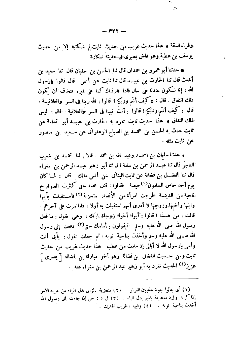 حَدَّثَنَا أَبُو عَمْرِو بْنُ حَمْدَانَ، قَالَ: ثنا الْحَسَنُ بْنُ سُفْيَانَ، قَالَ: ثنا سَعِيدُ بْنُ أَشْعَثَ، قَالَ: ثنا الْحَارِثُ بْنُ عُبَيْدٍ، قَالَ: ثنا ثَابِتٌ، عَنْ أَنَسٍ، قَالَ: قَالُوا: يَا رَسُولَ اللهِ: إِنَّا نَكُونُ عِنْدَكَ عَلَى حَالٍ، فَإِذَا فَارَقْنَاكَ كُنَّا عَلَى غَيْرِهِ، فَنَخَافُ أَنْ يكُونَ ذَلِكَ النِّفَاقَ قَالَ: «كَيْفَ أَنْتُمْ وَرَبُّكُمْ؟» قَالُوا: §اللهُ رَبُّنَا فِي السِّرِّ وَالْعَلَانِيَةِ قَالَ: «كَيْفَ أَنْتُمْ وَنَبِيُّكُمْ؟» قَالُوا: أَنْتَ نَبِيُّنَا فِي السِّرِّ وَالْعَلَانِيَةِ، قَالَ: «لَيْسَ ذَلِكَ النِّفَاقَ» هَذَا حَدِيثٌ ثَابِتٌ تَفَرَّدَ بِهِ الْحَارِثُ بْنُ عُبَيْدٍ أَبُو قُدَامَةَ عَنْ ثَابِتٍ حَدَّثَ بِهِ الْحَسَنُ بْنُ مُحَمَّدِ بْنِ الصَّبَّاحِ الزَّعْفَرَانِيُّ، عَنْ سَعِيدِ بْنِ مَنْصُورٍ، عَنْ ثَابِتٍ مِثْلَهُ