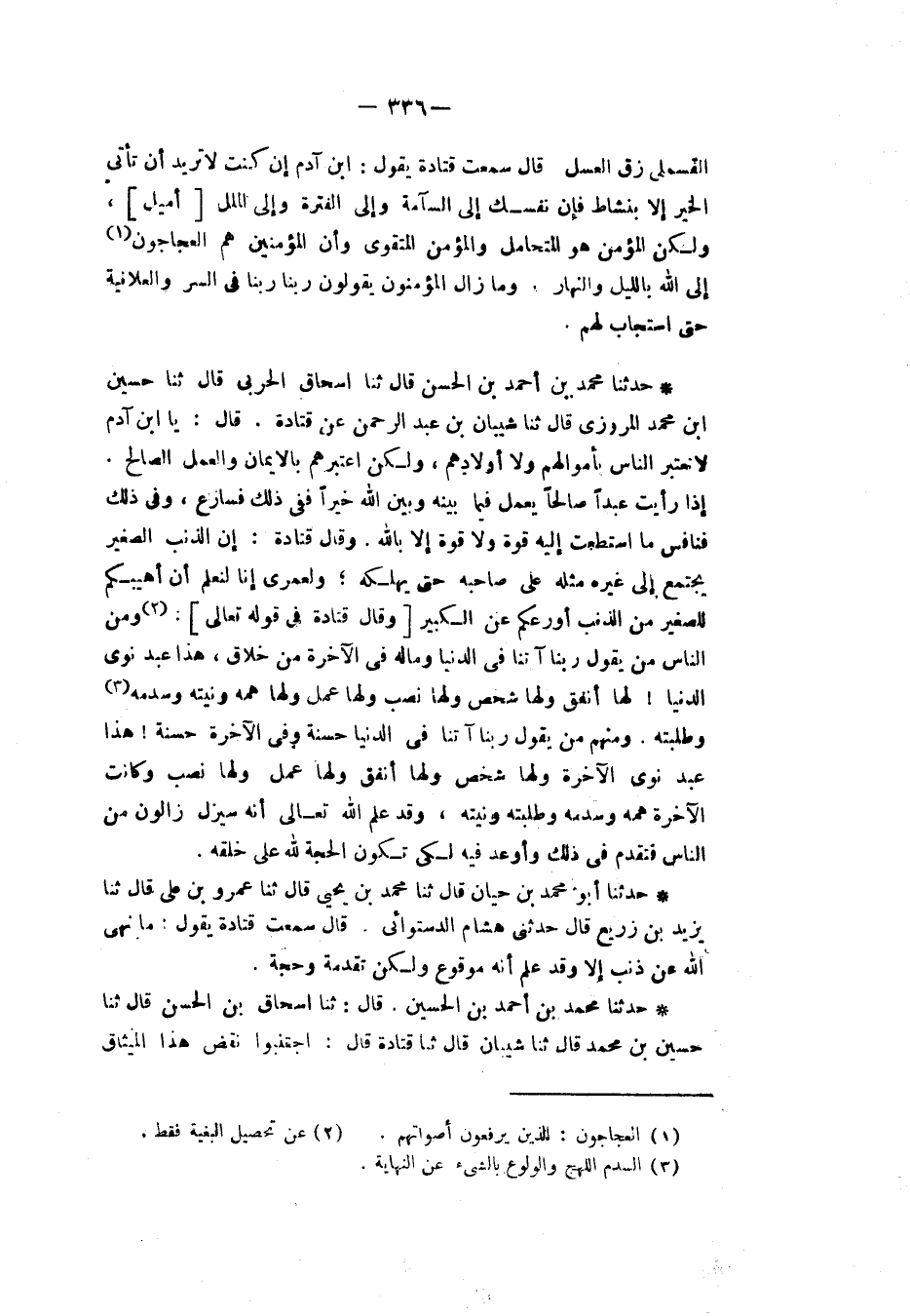 حَدَّثَنَا مُحَمَّدُ بْنُ أَحْمَدَ بْنِ الْحَسَنِ، قَالَ: ثنا إِسْحَاقُ الْحَرْبِيُّ، قَالَ: ثنا حُسَيْنُ بْنُ مُحَمَّدٍ الْمَرْوَزِيُّ، قَالَ: ثنا شَيْبَانُ بْنُ عَبْدِ الرَّحْمَنِ، عَنْ قَتَادَةَ، قَالَ: «يَا ابْنَ آدَمَ §لَا تَعْتَبِرِ النَّاسَ بِأَمْوَالِهِمْ وَلَا أَوْلَادِهِمْ وَلَكِنِ اعْتَبِرْهُمْ بِالْإِيمَانِ وَالْعَمَلِ الصَّالِحِ إِذَا رَأَيْتَ عَبْدًا صَالِحًا يَعْمَلُ فِيمَا بَيْنَهُ وَبَيْنَ اللهِ خَيْرًا فَفِي ذَلِكَ فَسَارِعْ، وَفِي ذَلِكَ فَنَافِسْ مَا اسْتَطَعْتَ إِلَيْهِ قُوَّةً وَلَا قُوَّةَ إِلَّا بِاللهِ»