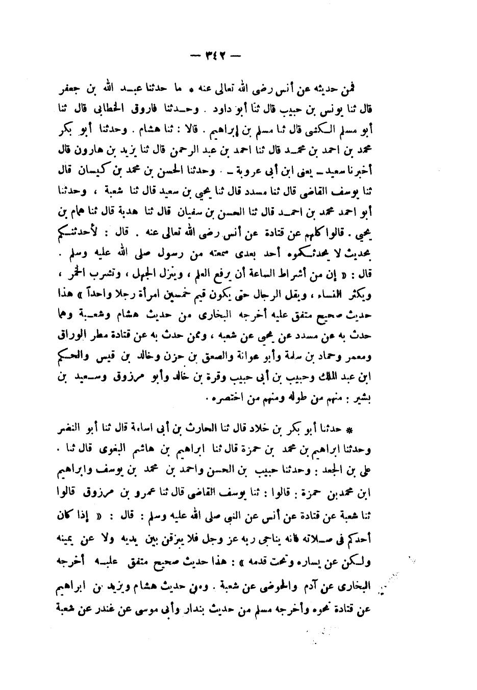 مَا حَدَّثَنَا عَبْدُ اللهِ بْنُ جَعْفَرٍ، قَالَ: ثنا يُونُسُ بْنُ حَبِيبٍ قَالَ: ثَنَا أَبُو دَاوُدَ: وَحَدَّثَنَا فَارُوقٌ الْخَطَّابِيُّ، قَالَ: ثنا أَبُو مُسْلِمٍ الْكَشِّيُّ، قَالَ: ثنا مُسْلِمُ بْنُ إِبْرَاهِيمَ، قَالَا: ثنا هِشَامٌ، وَحَدَّثَنَا أَبُو بَكْرٍ مُحَمَّدُ بْنُ أَحْمَدَ بْنِ مُحَمَّدٍ قَالَ: ثنا أَحْمَدُ بْنُ عَبْدِ الرَّحْمَنِ، قَالَ: ثنا يَزِيدُ بْنُ هَارُونَ، قَالَ: أَخْبَرَنَا سَعِيدٌ يَعْنِي ابْنَ أَبِي عَرُوبَةَ، وَحَدَّثَنَا الْحَسَنُ بْنُ مُحَمَّدِ بْنِ كَيْسَانَ، قَالَ: ثنا يُوسُفُ الْقَاضِي، قَالَ: ثنا مُسَدَّدٌ، قَالَ: ثنا يَحْيَى بْنُ سَعِيدٍ، قَالَ: ثنا شُعْبَةُ، وَحَدَّثَنَا أَبُو أَحْمَدَ مُحَمَّدُ بْنُ أَحْمَدَ قَالَ: ثنا الْحَسَنُ بْنُ سُفْيَانَ، قَالَ: ثنا هُدْبَةُ، قَالَ: ثنا هَمَّامُ بْنُ يَحْيَى، قَالُوا كُلُّهُمْ: عَنْ قَتَادَةَ، عَنْ أَنَسٍ، رَضِيَ اللهِ تَعَالَى عَنْهُ قَالَ: لَأُحَدِّثَنَّكُمْ بِحَدِيثٍ لَا يحَدِّثُكُمُوهُ أَحَدٌ بَعْدِي سَمِعْتُهُ مِنْ رَسُولِ اللهِ صَلَّى اللهُ عَلَيْهِ وَسَلَّمَ قَالَ: «إِنَّ §مِنْ أَشْرَاطِ السَّاعَةِ أَنْ يُرْفَعَ الْعِلْمُ وَينْزِلَ الْجَهْلُ وَتُشْرَبَ الْخَمْرُ وَيَكْثُرَ النِّسَاءُ وَيَقِلَّ الرِّجَالُ حَتَّى يَكُونَ قَيِّمُ خَمْسِينَ امْرَأَةً رَجُلًا وَاحِدًا» هَذَا حَدِيثٌ صَحِيحٌ مُتَّفَقٌ عَلَيْهِ أَخْرَجَهُ الْبُخَارِيُّ مِنْ حَدِيثِ هِشَامٍ، وَشُعْبَةَ وَهُمَا حَدَّثَ بِهِ عَنْ مُسَدَّدٍ عَنْ يَحْيَى، عَنْ شُعْبَةَ وَمِمَّنْ حَدَّثَ بِهِ عَنْ قَتَادَةَ، مَطَرٌ الْوَرَّاقُ، وَمَعْمَرٌ، وَحَمَّادُ بْنُ سَلَمَةَ، وَأَبُو عَوَانَةَ، وَالصَّعْقُ بْنُ حَزْنٍ، وَخَالِدُ بْنُ قَيْسٍ، وَالْحَكَمُ بْنُ عَبْدِ الْمَلِكِ، وَحَبِيبُ بْنُ أَبِي حَبِيبٍ، وَقُرَّةُ بْنُ خَالِدٍ، وَأَبُو مَرْزُوقٍ، وَسَعِيدُ بْنُ بَشِيرٍ مِنْهُمْ مَنْ طَوَّلَهُ وَمِنْهُمْ مَنِ اخْتَصَرَهُ