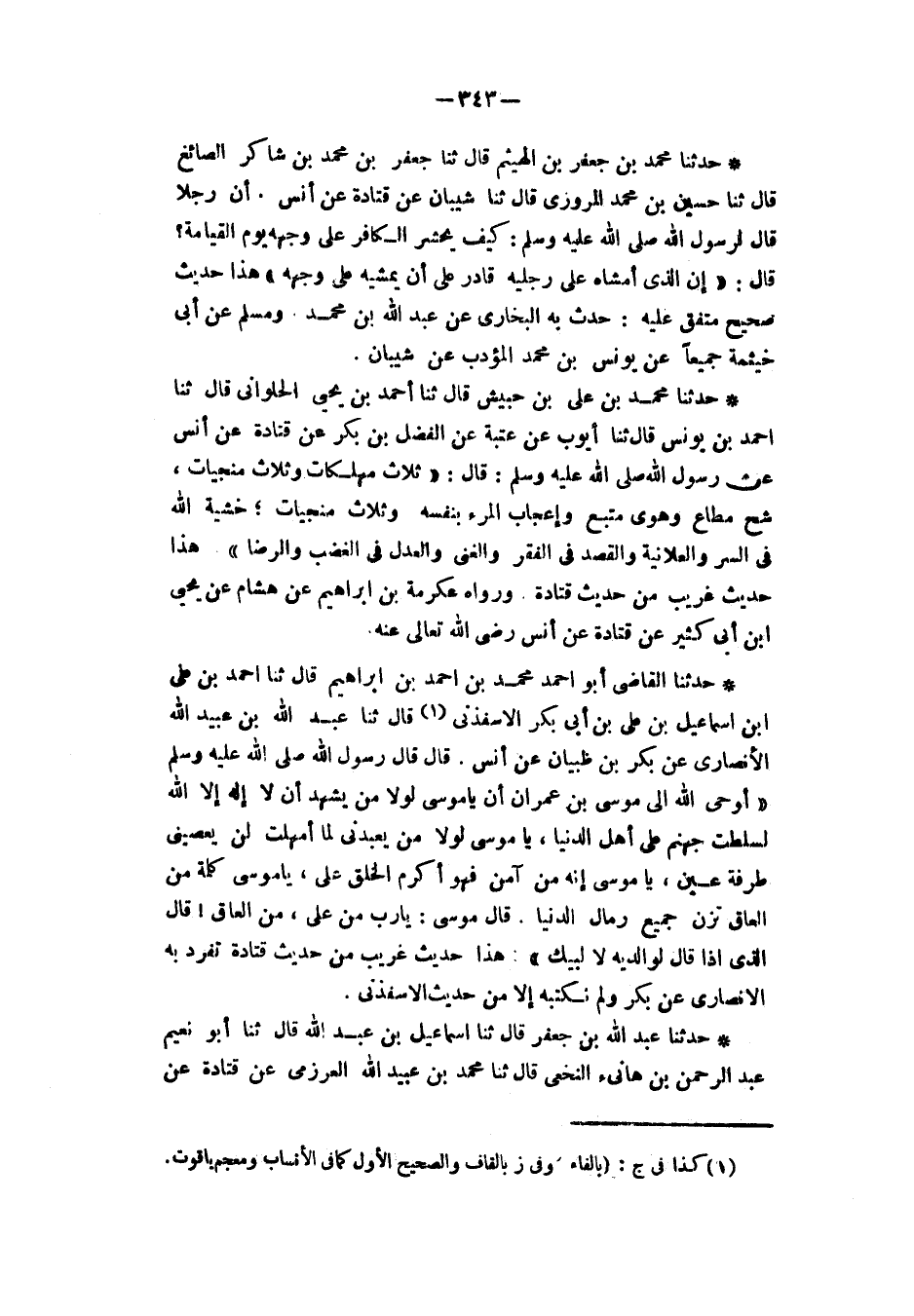 حَدَّثَنَا مُحَمَّدُ بْنُ عَلِيِّ بْنِ حُبَيْشٍ، قَالَ: ثنا أَحْمَدُ بْنُ يَحْيَى الْحُلْوَانِيُّ، قَالَ: ثنا أَحْمَدُ بْنُ يُونُسَ، قَالَ: ثنا أَيُّوبُ، عَنْ عُتْبَةَ، عَنِ الْفَضْلِ بْنِ بَكْرٍ، عَنْ قَتَادَةَ، عَنْ أَنَسٍ، عَنْ رَسُولِ اللهِ صَلَّى اللهُ عَلَيْهِ وَسَلَّمَ قَالَ: «§ثَلَاثٌ مُهْلِكَاتٌ وَثَلَاثٌ مُنْجِيَاتٌ شُحٌّ مُطَاعٌ وَهَوًى مُتَّبَعٌ وَإِعْجَابُ الْمَرْءِ بِنَفْسِهِ، وَثَلَاثٌ مُنْجِيَاتٌ خَشْيَةُ اللهِ فِي السِّرِّ وَالْعَلَانِيَةِ وَالْقَصْدُ فِي الْفَقْرِ وَالْغِنَى وَالْعَدْلُ فِي الْغَضَبِ وَالرِّضَا» هَذَا حَدِيثٌ غَرِيبٌ مِنْ حَدِيثِ قَتَادَةَ وَرَوَاهُ عِكْرِمَةُ بْنُ إِبْرَاهِيمَ، عَنْ هِشَامٍ، عَنْ يَحْيَى بْنِ أَبِي كَثِيرٍ، عَنْ أَنَسٍ رَضِيَ اللهِ تَعَالَى عَنْهُ