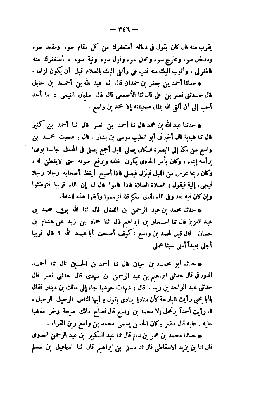 حَدَّثَنَا عَبْدُ اللهِ بْنُ مُحَمَّدٍ، قَالَ: ثنا أَحْمَدُ بْنُ نَصْرٍ، قَالَ: ثنا أَحْمَدُ بْنُ كَثِيرٍ، قَالَ: ثنا شَبَابَةُ، قَالَ: أَخْبَرَنِي أَبُو الطَّيِّبِ مُوسَى بْنُ بَشَّارٍ قَالَ: صَحِبْتُ مُحَمَّدَ بْنَ وَاسِعٍ مِنْ مَكَّةَ إِلَى الْبَصْرَةِ فَكَانَ §يُصَلِّي اللَّيْلَ أَجْمَعَ يُصَلِّي فِي الْمَحْمَلِ جَالِسًا يُومِئُ بِرَأْسِهِ إِيمَاءً وَكَانَ يَأْمُرُ الْحَادِي يَكُونُ خَلْفَهُ وَيَرْفَعُ صَوْتَهُ حَتَّى لَا يُفْطَنُ لَهُ وَكَانَ رُبَّمَا عَرَّسَ مِنَ اللَّيْلِ فَيَنْزِلُ فَيُصَلِّي فَإِذَا أَصْبَحَ أَيْقَظَ أَصْحَابَهُ رَجُلًا رَجُلًا فَيَجِيءُ إِلَيْهِ فَيَقُولُ: «الصَّلَاةَ الصَّلَاةَ» فَإِذَا قَامُوا قَالَ لَنَا: «إِنْ كَانَ الْمَاءُ قَرِيبًا فَتَوَضَّئُوا وَإِنْ كَانَ فِيهِ بُعْدٌ وَفِي الْمَاءِ الَّذِي مَعَكُمْ قِلَّةٌ فَتَيَمَّمُوا وَأَبْقُوا هَذِهِ لِلشَّفَةِ»