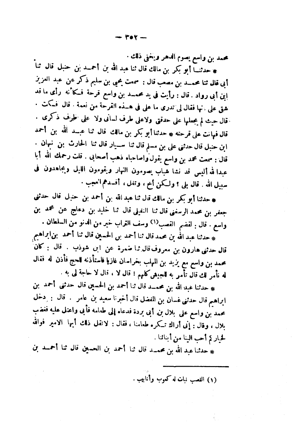 حَدَّثَنَا أَبُو بَكْرِ بْنُ مَالِكٍ، قَالَ: ثنا عَبْدُ اللهِ بْنُ أَحْمَدَ بْنِ حَنْبَلٍ، قَالَ: حَدَّثَنِي جَعْفَرُ بْنُ مُحَمَّدٍ الرَّسْغَنِيُّ، قَالَ: ثنا النُّفَيْلِيُّ، قَالَ: ثنا خُلَيْدُ بْنُ دَعْلَجٍ، عَنْ مُحَمَّدِ بْنِ وَاسِعٍ، قَالَ: «§لَقَضْمُ الْقَصَبِ وَسَفُّ التُّرَابِ خَيْرٌ مِنَ الدُّنُوِّ مِنَ السُّلْطَانِ»