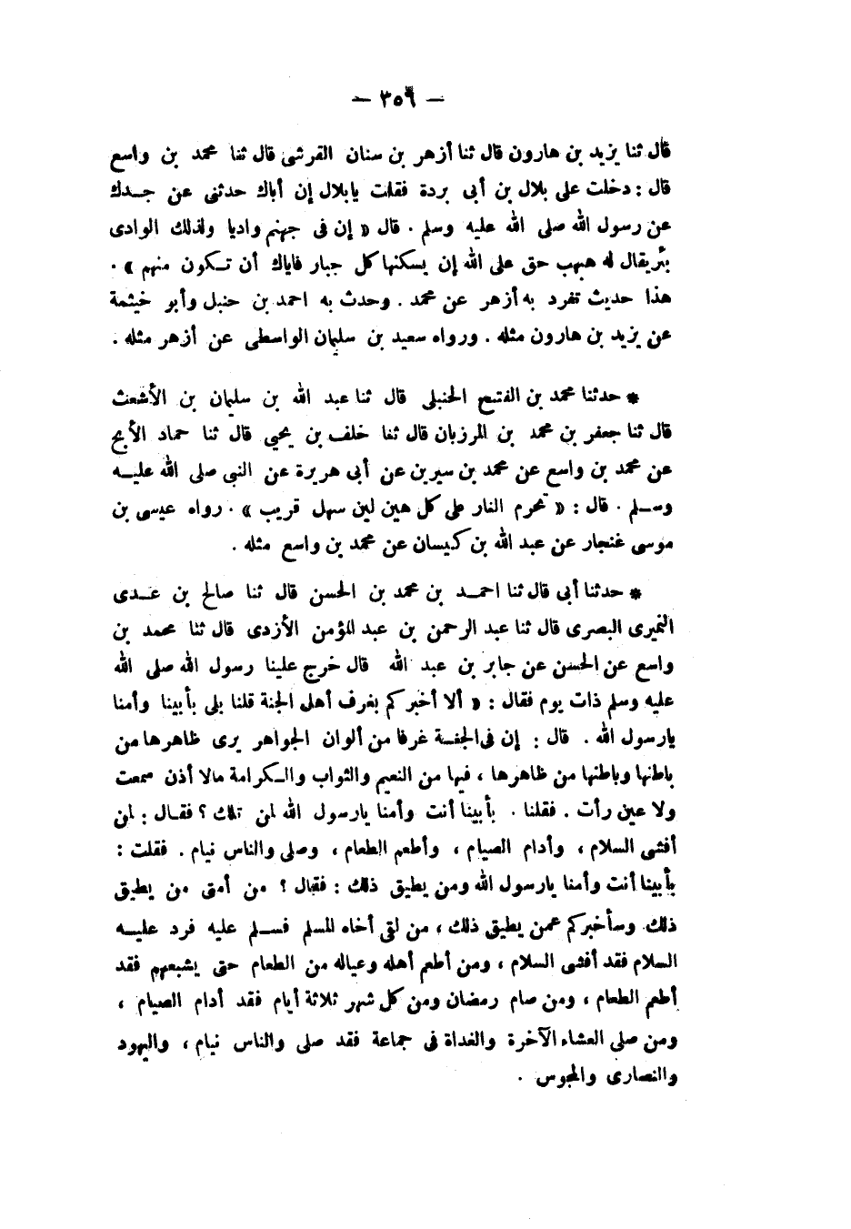 حَدَّثَنَا مُحَمَّدُ بْنُ الْفَتْحِ الْحَنْبَلِيُّ، قَالَ: ثنا عَبْدُ اللهِ بْنُ سُلَيْمَانَ بْنِ الْأَشْعَثِ، قَالَ: ثنا جَعْفَرُ بْنُ مُحَمَّدِ بْنِ الْمَرْزُبَانِ، قَالَ: ثنا خَلَفُ بْنُ يَحْيَى، قَالَ: ثنا حَمَّادٌ الْأَبَحُّ، عَنْ مُحَمَّدِ بْنِ وَاسِعٍ، عَنْ مُحَمَّدِ بْنِ سِيرِينَ، عَنْ أَبِي هُرَيْرَةَ، عَنِ النَّبِيِّ صَلَّى اللهُ عَلَيْهِ وَسَلَّمَ قَالَ: «§تُحَرَّمُ النَّارُ عَلَى كُلِّ هَيِّنٍ لَيِّنٍ سَهْلٍ قَرِيبٍ» رَوَاهُ عِيسَى بْنُ مُوسَى غُنْجَارُ، عَنْ عَبْدِ اللهِ بْنِ كَيْسَانَ، عَنْ مُحَمَّدِ بْنِ وَاسِعٍ مِثْلَهُ