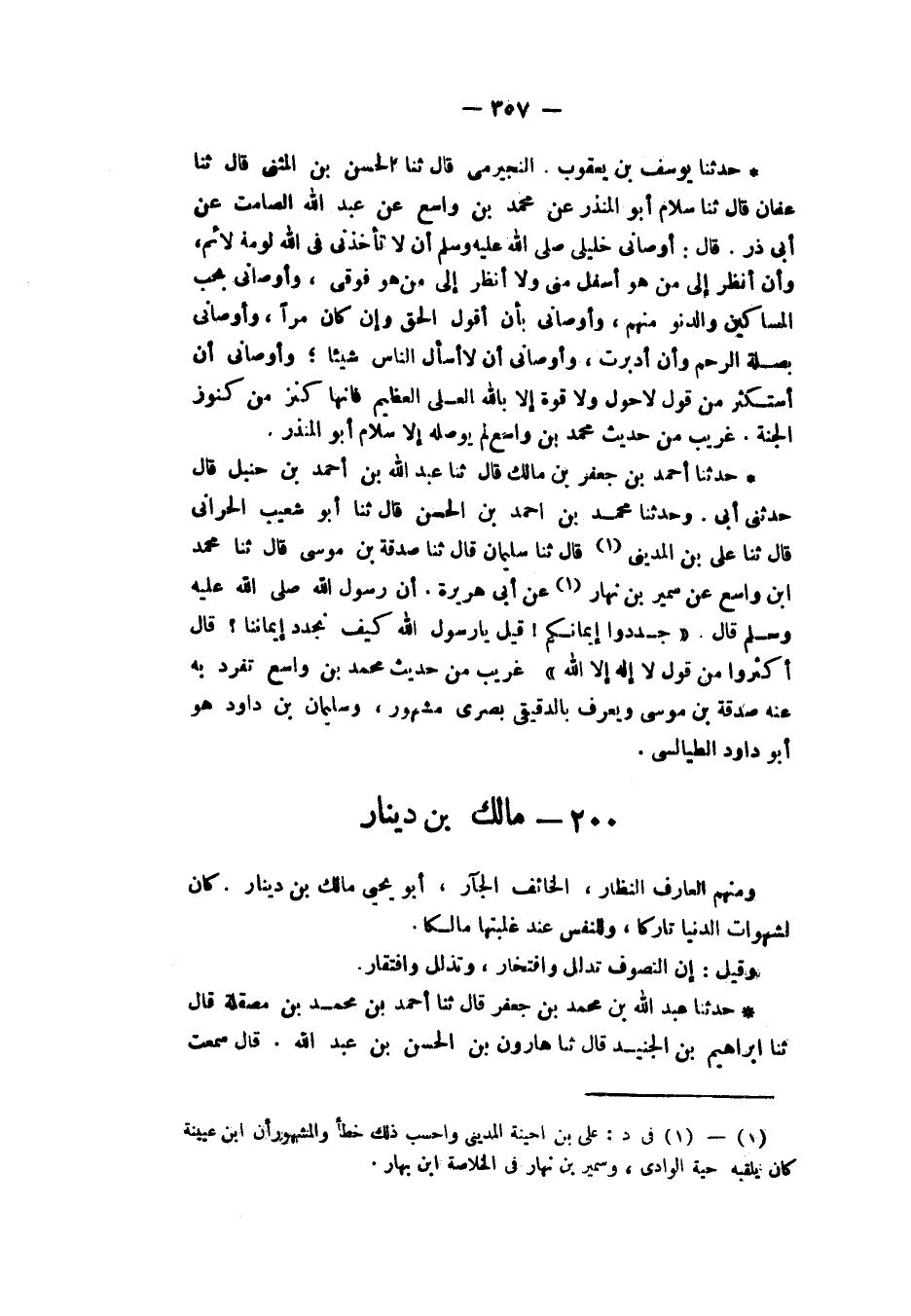 §مَالِكُ بْنُ دِينَارٍ وَمِنْهُمُ الْعَارِفُ النَّظَّارُ الْخَائِفُ الْجآرُ أَبُو يَحْيَى مَالِكُ بْنُ دِينَارٍ، كَانَ لِشَهَوَاتِ الدُّنْيَا تَارِكًا، وَلِلنَّفْسِ عِنْدَ غَلَبَتِهَا مَالِكًا. وَقِيلَ: إِنَّ التَّصَوُّفَ تَدَلُّلٌ وَافْتِخَارٌ وَتَذَلُّلٌ وَافْتِقَارٌ
