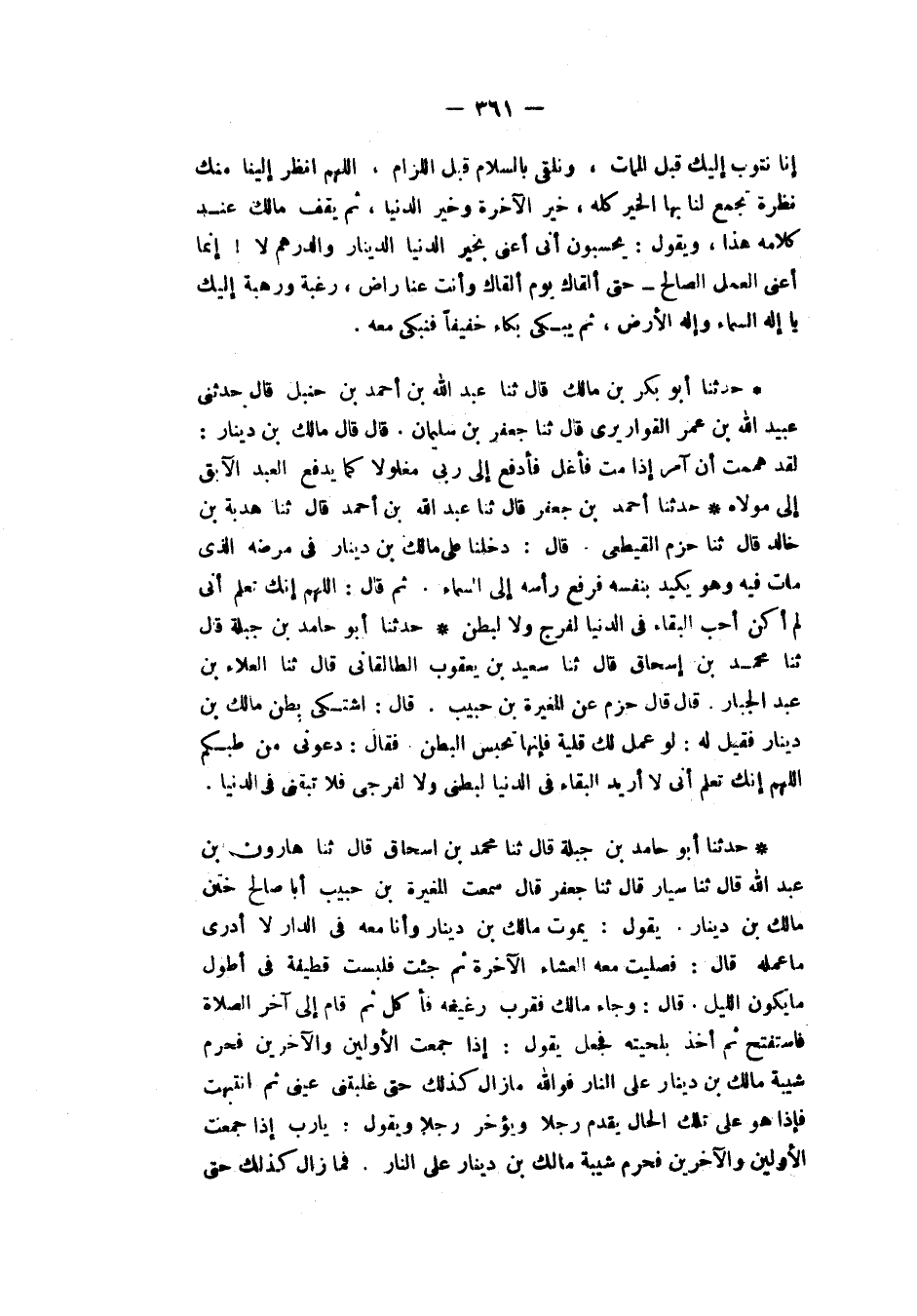 حَدَّثَنَا أَحْمَدُ بْنُ جَعْفَرٍ، قَالَ: ثنا عَبْدُ اللهِ بْنُ أَحْمَدَ، قَالَ: ثنا هُدْبَةُ بْنُ خَالِدٍ، قَالَ: ثنا حَزْمٌ الْقَطِيعِيُّ، قَالَ: دَخَلْنَا عَلَى مَالِكِ بْنِ دِينَارٍ فِي مَرَضِهِ الَّذِي مَاتَ فِيهِ وَهُوَ يَكِيدُ بِنَفْسِهِ فَرَفَعَ رَأْسَهُ إِلَى السَّمَاءِ ثُمَّ قَالَ: «§اللهُمَّ إِنَّكَ تَعْلَمُ أَنِّي لَمْ أَكُنْ أُحِبَّ الْبَقَاءَ فِي الدُّنْيَا لِفَرْجٍ وَلَا لِبَطْنٍ»