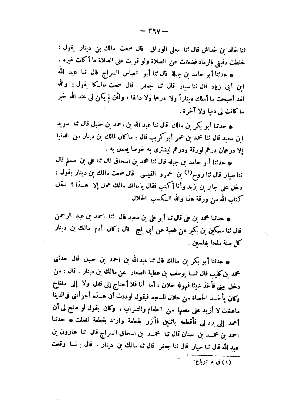 حَدَّثَنَا أَبُو حَامِدِ بْنُ جَبَلَةَ، قَالَ: ثنا مُحَمَّدُ بْنُ إِسْحَاقَ، قَالَ: ثنا عَلِيُّ بْنُ مُسْلِمٍ، قَالَ: ثنا سَيَّارٌ، قَالَ: ثنا رَوْحُ بْنُ عَمْرٍو الْقَيْسِيُّ، قَالَ: سَمِعْتُ مَالِكَ بْنَ دِينَارٍ، يَقُولُ: دَخَلَ عَلَيَّ جَابِرُ بْنُ يَزِيدَ وَأَنَا أَكْتُبُ، فَقَالَ: يَا مَالِكُ مَا لَكَ عَمَلٌ إِلَّا هَذَا؟ §تَنْقُلُ كِتَابَ اللهِ مِنْ وَرَقَةٍ إِلَى وَرَقَةٍ، هَذَا وَاللهِ الْكَسْبُ الْحَلَالُ