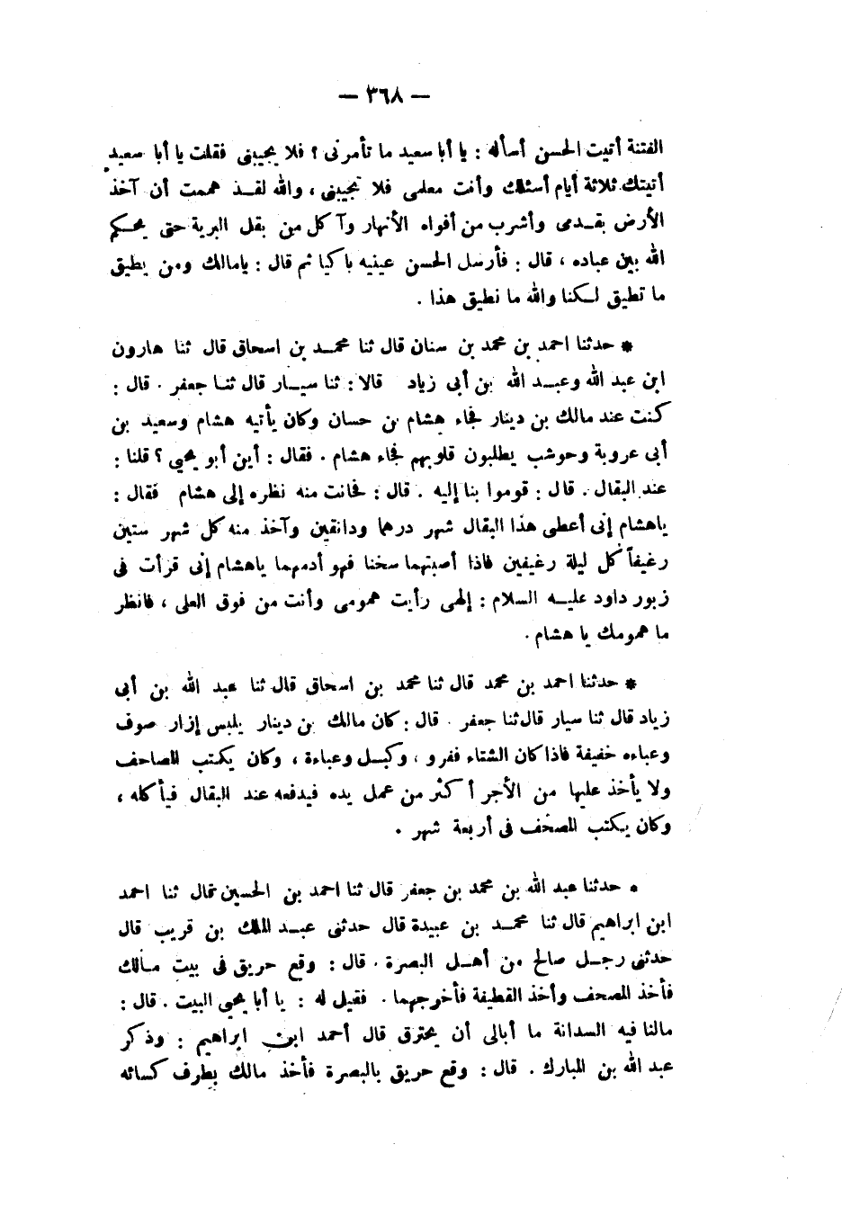 حَدَّثَنَا أَحْمَدُ بْنُ مُحَمَّدِ بْنِ سِنَانَ، قَالَ: ثنا مُحَمَّدُ بْنُ إِسْحَاقَ، قَالَ: ثنا هَارُونُ بْنُ عَبْدِ اللهِ، وَعَبْدُ اللهِ بْنُ أَبِي زِيَادٍ، قَالَا: ثنا سَيَّارٌ، قَالَ: ثنا جَعْفَرٌ، قَالَ: كُنْتُ عِنْدَ مَالِكِ بْنِ دِينَارٍ فَجَاءَ هِشَامُ بْنُ حَسَّانَ وَكَانَ يأْتِيهِ هِشَامٌ، وَسَعِيدُ بْنُ أَبِي عَرُوبَةَ، وَحَوْشَبٌ يَطْلُبُونَ قُلُوبَهُمْ فَجَاءَ هِشَامٌ فَقَالَ: «أَيْنَ أَبُو يَحْيَى» قُلْنَا: عِنْدَ الْبَقَّالَ قَالَ: «قُومُوا بِنَا إِلَيْهِ» قَالَ: فَحَانَتْ مِنْهُ نَظْرَةٌ إِلَى هِشَامٍ، فَقَالَ: يَا هِشَامُ إِنِّي أُعْطِي هَذَا الْبَقَّالَ كُلَّ شَهْرٍ دِرْهَمًا وَدَانَقَيْنِ وَآخُذُ مِنْهُ كُلَّ شَهْرٍ سِتِّينَ رَغِيفًا كُلَّ لَيْلَةٍ رَغِيفَيْنِ فَإِذَا أَصَبْتُهُمَا سَخْنًا فَهُوَ أَدَمُهُمَا يَا هِشَامُ إِنِّي قَرَأْتُ فِي زَبُورِ دَاوُدَ عَلَيْهِ السَّلَامُ: §إِلَهِيَ رَأَيْتُ هُمُومِي وَأَنْتَ مِنْ فَوْقِ الْعُلَا فَانْظُرْ مَا هُمُومَكَ يَا هِشَامُ "