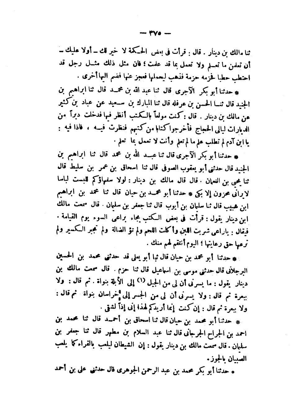 حَدَّثَنَا أَبُو بَكْرٍ الْآجُرِّيُّ، قَالَ: ثَنَا عَبْدُ اللهِ بْنُ مُحَمَّدٍ، قَالَ: ثَنَا إِبْرَاهِيمَ بْنُ الْجُنَيْدِ، قَالَ: ثَنَا الْحَسَنُ بْنُ عَرَفَةَ، قَالَ: ثَنَا الْمُبَارَكُ بْنُ سَعِيدٍ، عَنْ عَبَّادِ بْنِ كَثِيرٍ، عَنْ مَالِكِ بْنِ دِينَارٍ، قَالَ: " كُنْتُ مُولَعًا بِالْكُتُبِ أَنْظُرُ فِيهَا فَدَخَلْتُ دَيْرًا مِنَ الدَّيَّارَاتِ لَيَالِيَ الْحُجَّاجِ فَأَخْرَجُوا كِتَابًا مِنْ كُتُبِهِمْ فَنَظَرْتُ فِيهِ فَإِذَا فِيهِ: يَا ابْنَ آدَمَ §لِمَ تَطْلُبْ عِلْمَ مَا لَمْ تَعْلَمْ وَأَنْتَ لَا تَعْمَلُ بِمَا تَعْلَمُ؟ "