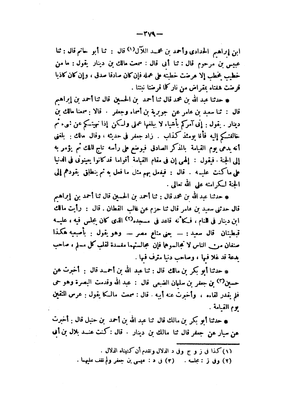 حَدَّثَنَا عَبْدُ اللهِ بْنُ مُحَمَّدٍ، قَالَ: ثَنَا أَحْمَدُ بْنُ الْحُسَيْنِ، قَالَ: ثَنَا أَحْمَدُ بْنُ إِبْرَاهِيمَ، قَالَ: حَدَّثَنِي سَعِيدُ بْنُ عَامِرٍ، قَالَ: ثَنَا حَزْمٌ، عَنْ غَالِبٍ الْقَطَّانِ، قَالَ: " رَأَيْتُ مَالِكَ بْنَ دِينَارٍ فِي الْمَنَامِ فَكَأَنَّهُ قَاعِدٌ فِي مَسْجِدِهِ الَّذِي كَانَ يَجْلِسُ فِيهِ عَلَيْهِ قُبْطِيَّتَانِ قَالَ سَعِيدٌ: يَعْنِي مَتَاعَ مِصْرٍ، وَهُوَ يَقُولُ: بِأُصْبُعَيْهِ هَكَذَا: §صِنْفَانِ مِنَ النَّاسِ لَا تُجَالِسُوهُمَا فَإِنَّ مُجَالَسَتَهُمَا مُفْسِدَةٌ لَقَلْبُ كُلِّ مُسْلِمٍ: صَاحِبُ بِدْعَةٍ قَدْ غَلَا فِيهَا وَصَاحِبُ دُنْيَا مُتْرَفٍ فِيهَا "