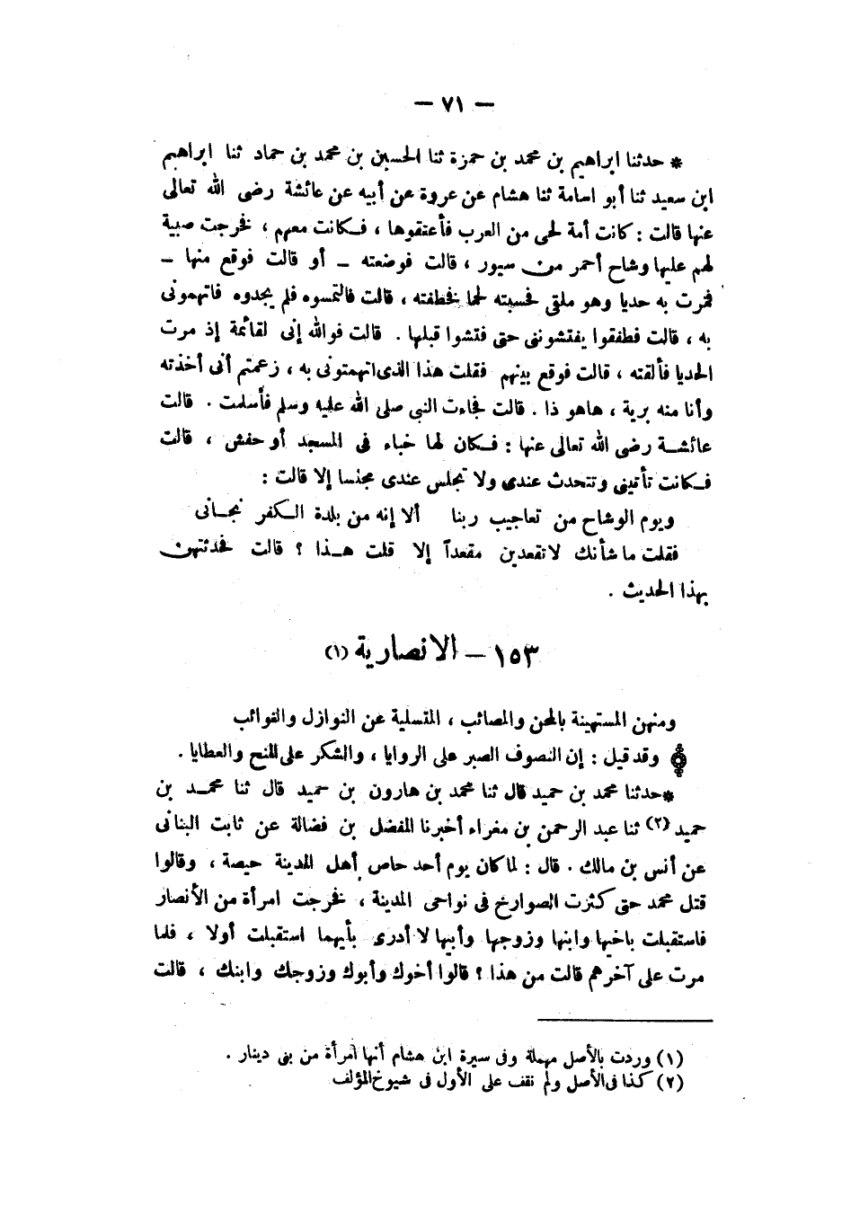 حَدَّثَنَا إِبْرَاهِيمُ بْنُ مُحَمَّدِ بْنِ حَمْزَةَ، ثنا الْحُسَيْنُ بْنُ مُحَمَّدِ بْنِ حَمَّادٍ، ثنا إِبْرَاهِيمُ بْنُ سَعِيدٍ، ثنا أَبُو أُسَامَةَ، ثنا هِشَامُ بْنُ عُرْوَةَ، عَنْ أَبِيهِ، عَنْ عَائِشَةَ، رَضِيَ اللهُ تَعَالَى عَنْهَا قَالَتْ: " كَانَتْ أَمَةً لُحَيٍّ مِنَ الْعَرَبِ فَأَعْتَقُوهَا فَكَانَتْ مَعَهُمْ فَخَرَجَتْ صَبِيَّةٌ لَهُمْ عَلَيْهَا وِشَاحٌ أَحْمَرُ مِنْ سُيورٍ قَالَتْ: فَوَضَعَتْهُ - أَوْ قَالَتْ: فَوَقَعَ مِنْهَا - §فَمَرَّتْ بِهِ حُدَيَّا وَهُوَ مُلْقًى فَحَسِبَتْهُ لَحْمًا فَخَطِفَتْهُ قَالَتْ: فَالْتَمَسُوهُ فَلَمْ يَجِدُوهُ فَاتَّهَمُونِي بِهِ قَالَتْ: فَطَفِقُوا يُفَتِّشُونَنِي حَتَّى فَتَّشُوا قُبُلَهَا قَالَتْ: فَوَاللهِ إِنِّي لَقَائِمَةٌ إِذْ مَرَّتِ الْحُدَيَّا فَأَلْقَتْهُ قَالَتْ: فَوَقَعَ بَيْنَهُمْ فَقُلْتُ: هَذَا الَّذِي اتَّهَمْتُمُونِي بِهِ زَعَمْتُمْ أَنِّي أَخَذْتُهُ وَأَنَا مِنْهُ بَرِيئَةٌ هَا هُوَ ذَا قَالَتْ: فَجَاءَتِ النَّبِيَّ صَلَّى اللهُ عَلَيْهِ وَسَلَّمَ فَأَسْلَمَتْ، قَالَتْ عَائِشَةُ رَضِيَ اللهُ تَعَالَى عَنْهَا: فَكَانَ لَهَا خِبَاءٌ فِي الْمَسْجِدِ أَوْ حِفْشٌ قَالَتْ: فَكَانَتْ تَأْتِيَنِي وَتَتَحَدَّثُ عِنْدِي وَلَا تَجْلِسُ مَجْلِسًا إِلَّا قَالَتْ:
