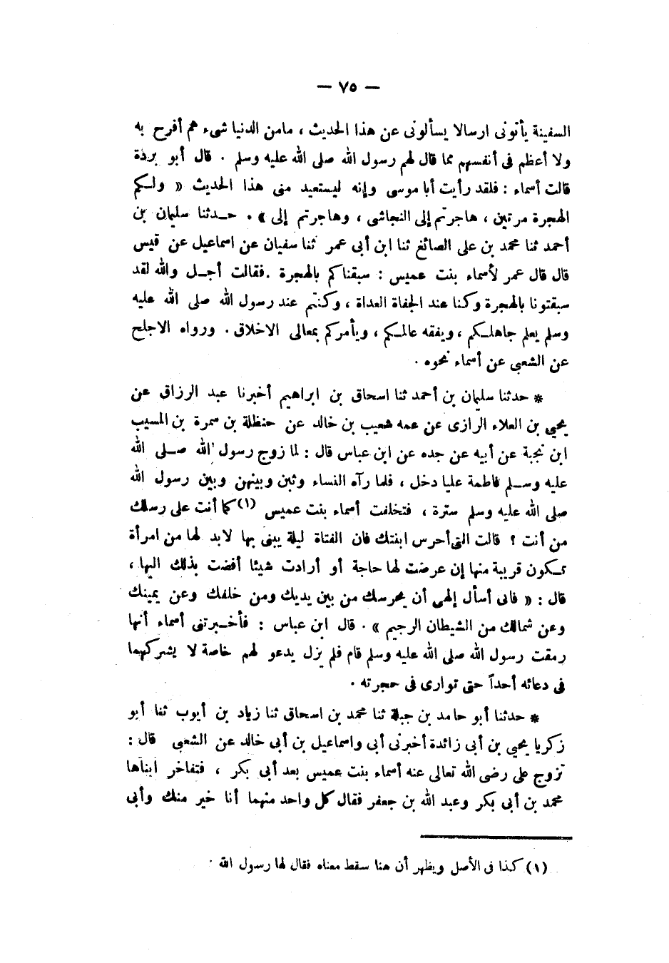 حَدَّثَنَا سُلَيْمَانُ بْنُ أَحْمَدَ، ثنا مُحَمَّدُ بْنُ عَلِيٍّ الصَّائِغُ، ثنا ابْنُ أَبِي عُمَرَ، ثنا سُفْيَانُ، عَنْ إِسْمَاعِيلَ، عَنْ قَيْسٍ، قَالَ: قَالَ عُمَرُ لِأَسْمَاءَ بِنْتِ عُمَيْسٍ: سَبَقْنَاكُمْ بِالْهِجْرَةِ فَقَالَتْ: «أَجَلْ وَاللهِ لَقَدْ §سَبَقْتُمُونَا بِالْهِجْرَةِ وَكُنَّا عِنْدَ الْجُفَاةِ الْعُدَاةِ وَكُنْتُمْ عِنْدَ رَسُولِ اللهِ صَلَّى اللهُ عَلَيْهِ وَسَلَّمَ يُعَلِّمُ جَاهِلَكُمْ وَيُفَقِّهُ عَالِمَكُمْ وَيَأْمُرُكُمْ بِمَعَالِي الْأَخْلَاقِ». وَرَوَاهُ الْأَجْلَحُ، عَنِ الشَّعْبِيِّ، عَنْ أَسْمَاءَ، نَحْوَهُ