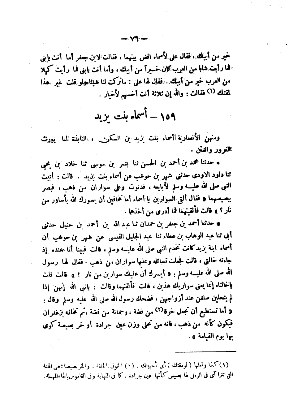 حَدَّثَنَا أَحْمَدُ بْنُ جَعْفَرِ بْنِ حَمْدَانَ، ثنا عَبْدُ اللهِ بْنُ أَحْمَدَ بْنِ حَنْبَلٍ، حَدَّثَنِي أَبِي، ثنا عَبْدُ الْوَهَّابِ بْنُ عَطَاءٍ، ثنا عَبْدُ الْجَلِيلِ الْقَيْسِيُّ، عَنْ شَهْرِ بْنِ حَوْشَبٍ، أَنَّ أَسْمَاءَ ابْنَةَ يَزِيدَ، كَانَتْ تَخْدُمُ النَّبِيَّ صَلَّى اللهُ عَلَيْهِ وَسَلَّمَ قَالَتْ: فَبَيْنَا أَنا عِنْدَهُ إِذْ جَاءَتْهُ خَالَتِي قَالَتْ: فَجَعَلَتْ تُسَائِلُهُ وَعَلَيْهَا سِوَارَانِ مِنْ ذَهَبٍ فَقَالَ لَهَا رَسُولُ اللهِ صَلَّى اللهُ عَلَيْهِ وَسَلَّمَ: «§أَيَسُرُّكِ أَنَّ عَلَيْكِ سِوَارَيْنِ مِنْ نَارٍ؟» قَالَتْ: قُلْتُ: يَا خَالَتَاهُ إِنَّمَا يَعْنِي سِوَارَيْكِ هَذَيْنِ قَالَتْ: فَأَلْقَتْهُمَا وَقَالَتْ: يَا نَبِيَّ اللهِ، إِنَّهُنَّ إِذَا لَمْ يَتَحَلَّيْنَ صَلِفْنَ عِنْدَ أَزْوَاجِهِنَّ فَضَحِكَ رَسُولُ اللهِ صَلَّى اللهُ عَلَيْهِ وَسَلَّمَ وَقَالَ: «أَمَا تَسْتَطِيعُ أَنْ تَجْعَلَ خَوْقًا مِنْ فِضَّةٍ وَجُمَانَةً مِنْ فِضَّةٍ ثُمَّ تَخْلُقُهُ بِزَعْفَرَانٍ فَيَكُونُ كَأَنَّهُ مِنْ ذَهَبٍ فَإِنَّهُ مَنْ تَحَلَّى وَزْنَ عَيْنِ جَرَادَةٍ أَوْ خَرْبَصِيصَةٍ كُوِيَ بِهَا يَوْمَ الْقِيَامَةِ»