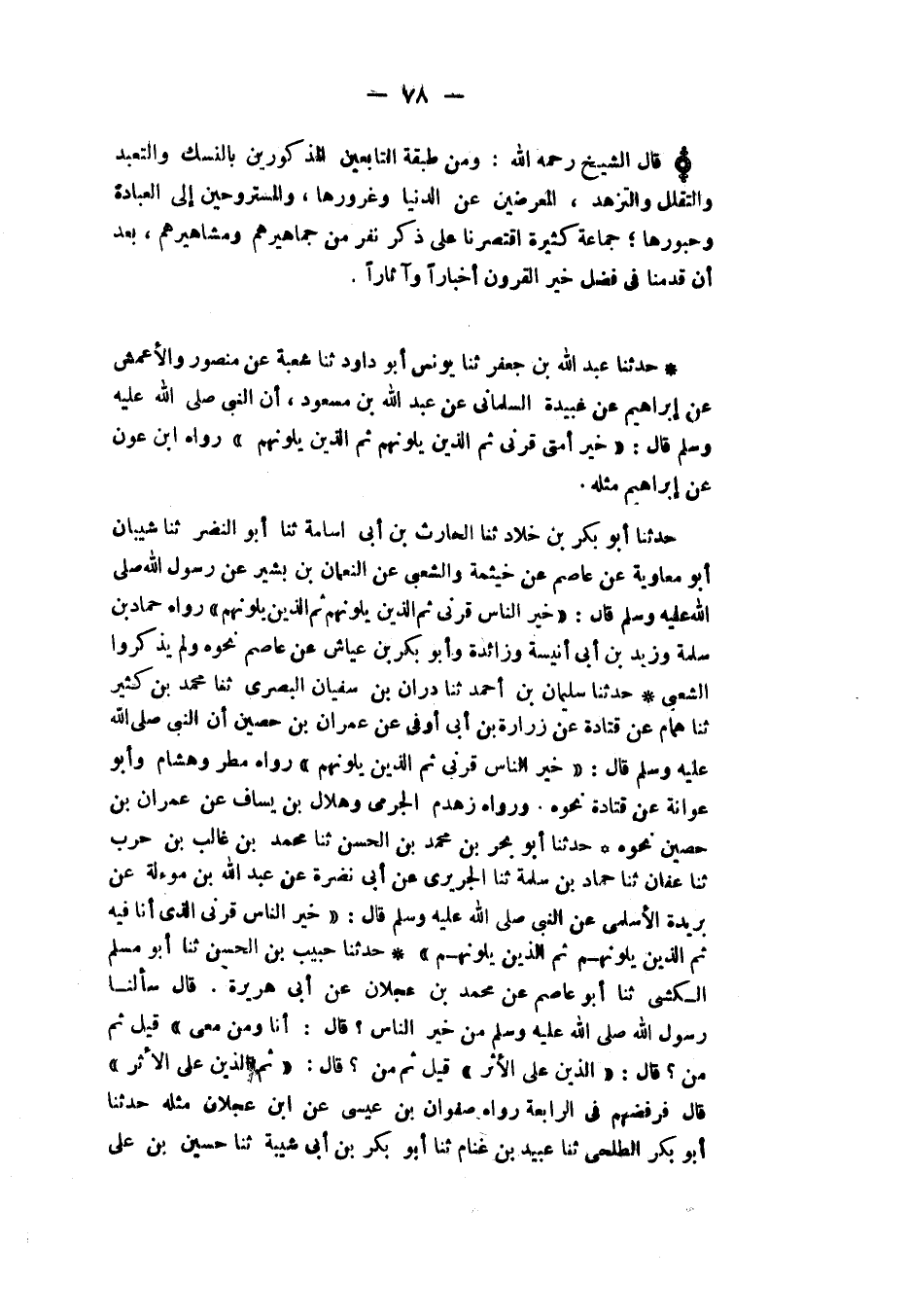 حَدَّثَنَا أَبُو بَكْرٍ الطَّلْحِيُّ، ثنا عُبَيْدُ بْنُ غَنَّامٍ، ثنا أَبُو بَكْرِ بْنُ أَبِي شَيْبَةَ، ثنا حُسَيْنُ بْنُ عَلِيٍّ، -[79]- عَنْ زَائِدَةَ، عَنِ السُّدِّيِّ، عَنْ عَبْدِ اللهِ الْبَهِيِّ، عَنْ عَائِشَةَ، رَضِيَ اللهُ عَنْهَا قَالَتْ: سَأَلَ رَجُلٌ النَّبِيَّ صَلَّى اللهُ عَلَيْهِ وَسَلَّمَ: §أَيُّ النَّاسِ خَيْرٌ؟ قَالَ: «الْقَرْنُ الَّذِي أَنا فِيهِ ثُمَّ الثَّانِي ثُمَّ الثَّالِثُ» رَوَاهُ أَبُو سَعِيدٍ الْخُدْرِيُّ، وَأَبُو بَرْزَةَ الْأَسْلَمِيُّ، وَسَمُرَةُ بْنُ جُنْدُبٍ، وَسَعْدٌ أَبُو بِلَالِ بْنُ سَعْدٍ فِي آخَرِينَ، عَنِ النَّبِيِّ صَلَّى اللهُ عَلَيْهِ وَسَلَّمَ نَحْوَهُ