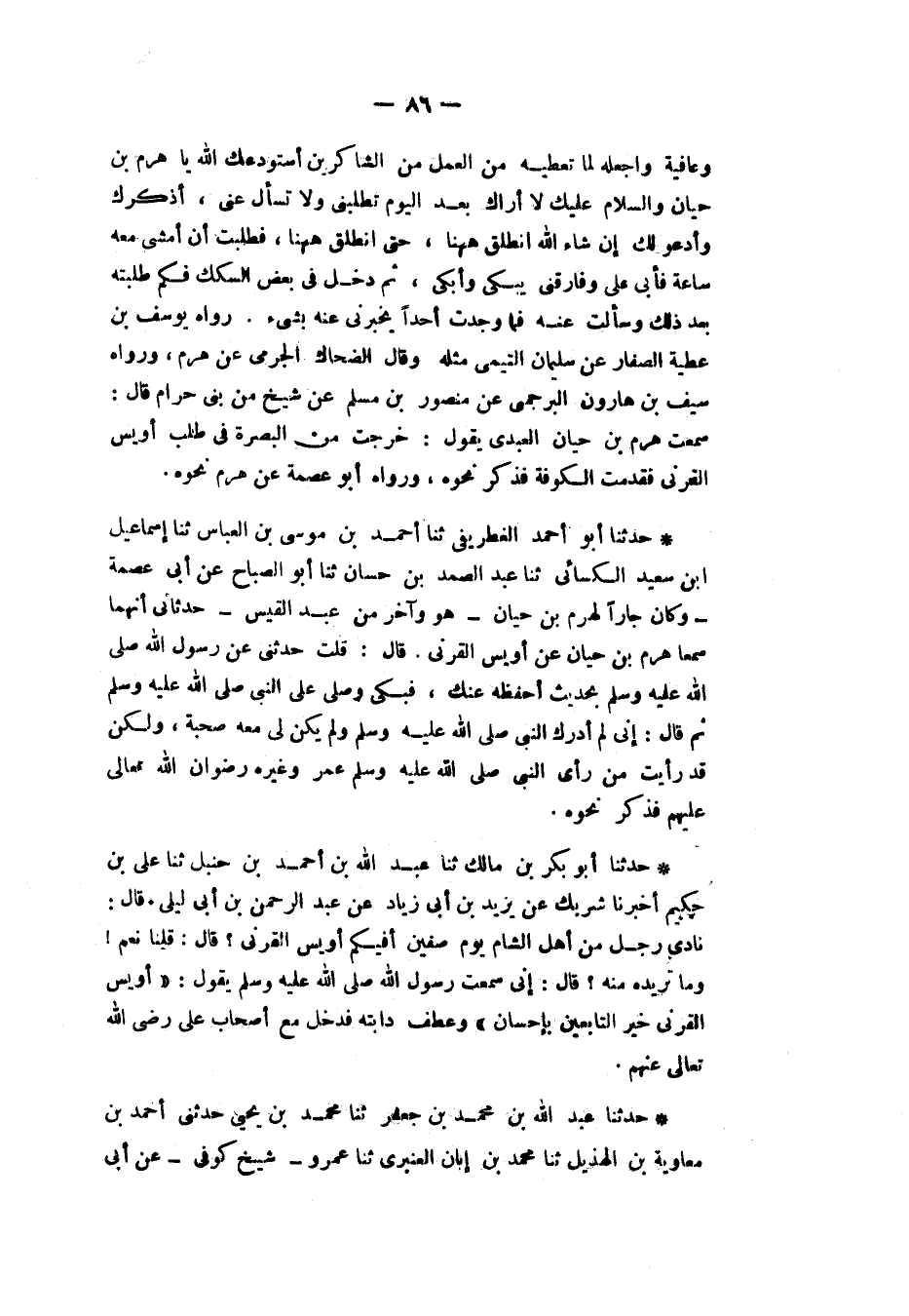 حَدَّثَنَا أَبُو بَكْرِ بْنُ مَالِكٍ، ثنا عَبْدُ اللهِ بْنُ أَحْمَدَ بْنِ حَنْبَلٍ، ثنا عَلِيُّ بْنُ حَكِيمٍ، أَخْبَرَنَا شَرِيكٌ، عَنْ يَزِيدَ بْنِ أَبِي زِيَادٍ، عَنْ عَبْدِ الرَّحْمَنِ بْنِ أَبِي لَيْلَى، قَالَ: نَادَى رَجُلٌ مِنْ أَهْلِ الشَّامِ يَوْمَ صِفِّينَ: أَفِيكُمْ أُوَيْسٌ الْقَرَنِيُّ قَالَ: قُلْنَا: نَعَمْ وَمَا تُرِيدُ مِنْهُ؟ قَالَ: إِنِّي سَمِعْتُ رَسُولَ اللهِ صَلَّى اللهُ عَلَيْهِ وَسَلَّمَ يَقُولُ: «§أُوَيْسٌ الْقَرَنِيُّ خَيْرُ التَّابِعِينَ بِإِحْسَانٍ» وَعَطَفَ دَابَّتَهُ فَدَخَلَ مَعَ أَصْحَابِ عَلِيٍّ رَضِيَ اللهُ تَعَالَى عَنْهُمْ