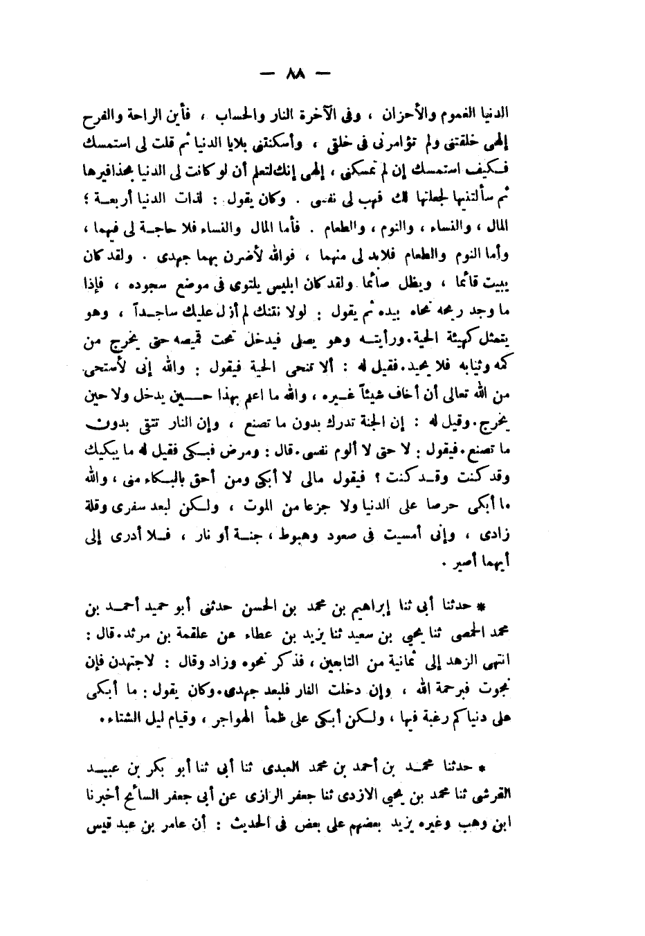 حَدَّثَنَا أَبِي، ثنا إِبْرَاهِيمُ بْنُ مُحَمَّدِ بْنِ الْحَسَنِ، حَدَّثَنِي أَبُو حُمَيْدٍ أَحْمَدُ بْنُ مُحَمَّدٍ الْحِمْصِيُّ، ثنا يَحْيَى بْنُ سَعِيدٍ، ثنا يَزِيدُ بْنُ عَطَاءٍ، عَنْ عَلْقَمَةَ بْنِ مَرْثَدٍ، قَالَ: «§انْتَهَى الزُّهْدُ إِلَى ثَمَانِيَةٍ مِنَ التَّابِعِينَ» فَذَكَرَ نَحْوَهُ وَزَادَ وَقَالَ: " لَأَجْتَهِدَنَّ فَإِنْ نَجَوْتُ فَبِرَحْمَةِ اللهِ وَإِنْ دَخَلْتُ النَّارَ فَلِبُعْدِ جَهْدِي وَكَانَ يَقُولُ: مَا أَبْكِي عَلَى دُنْيَاكُمْ رَغْبَةً فِيهَا وَلَكِنْ أَبْكِي عَلَى ظَمَأِ الْهَوَاجِرِ وَقِيَامِ لَيْلِ الشِّتَاءِ "