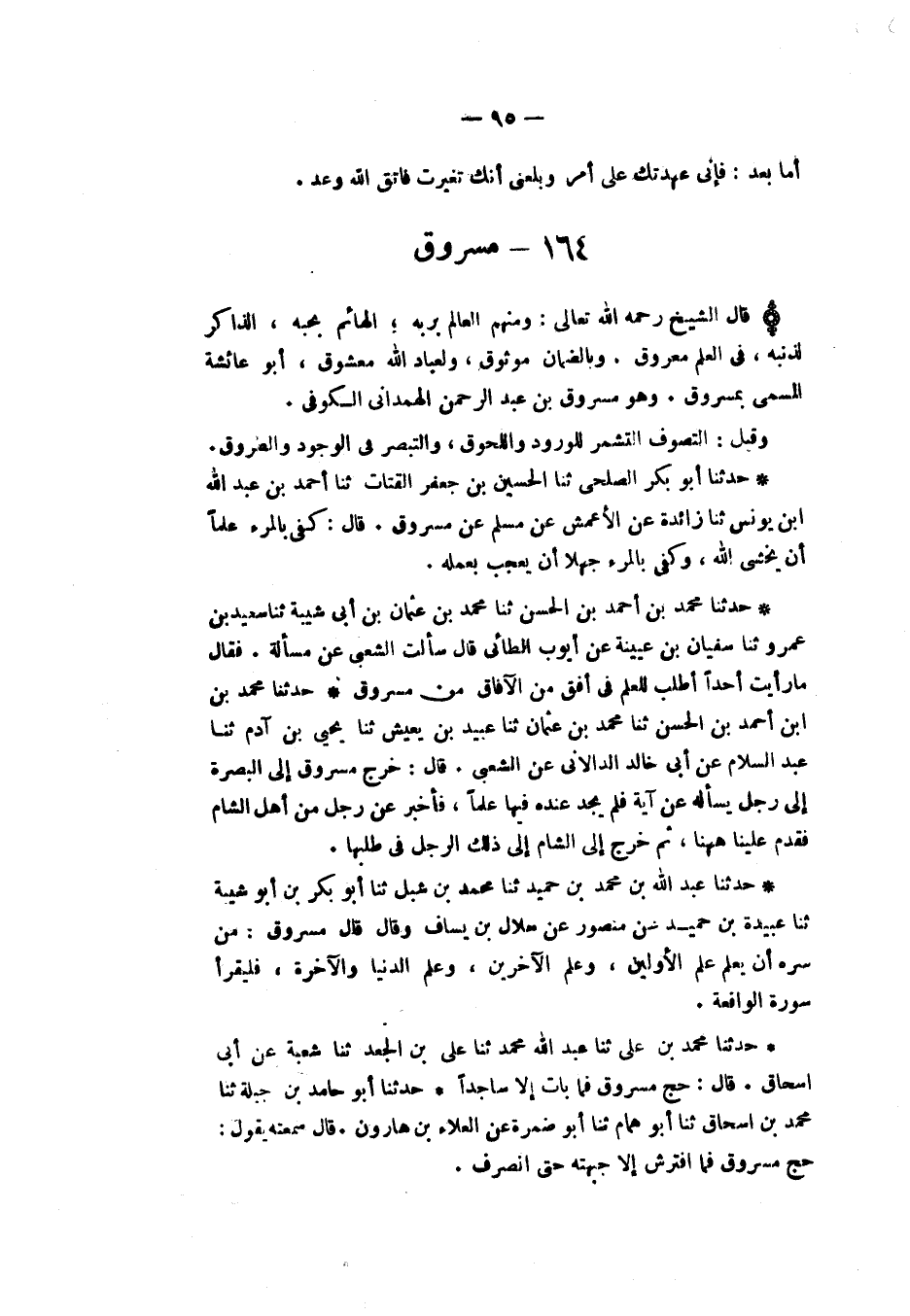 §مَسْرُوقٌ قَالَ الشَّيْخُ رَحِمَهُ اللهُ تَعَالَى: وَمِنْهُمُ الْعَالِمُ بِرَبِّهِ الْهَائِمُ بِحُبِّهِ الذَّاكِرُ لِذَنْبِهِ، فِي الْعِلْمِ مَعْرُوقٌ وَبِالضَّمَانِ مَوْثُوقٌ، وَلِعِبَادِ اللهِ مَعْشُوقٌ أَبُو عَائِشَةَ الْمُسَمَّى بِمَسْرُوقٍ، وَهُوَ مَسْرُوقُ بْنُ عَبْدِ الرَّحْمَنِ الْهَمْدَانِيُّ الْكُوفِيُّ وَقِيلَ: التَّصَوُّفُ التَّشَمُّرُ لِلْوُرُودِ، وَاللُّحُوقُ وَالتَّبَصُّرُ فِي الْوُجُودِ وَالطُّرُوقِ