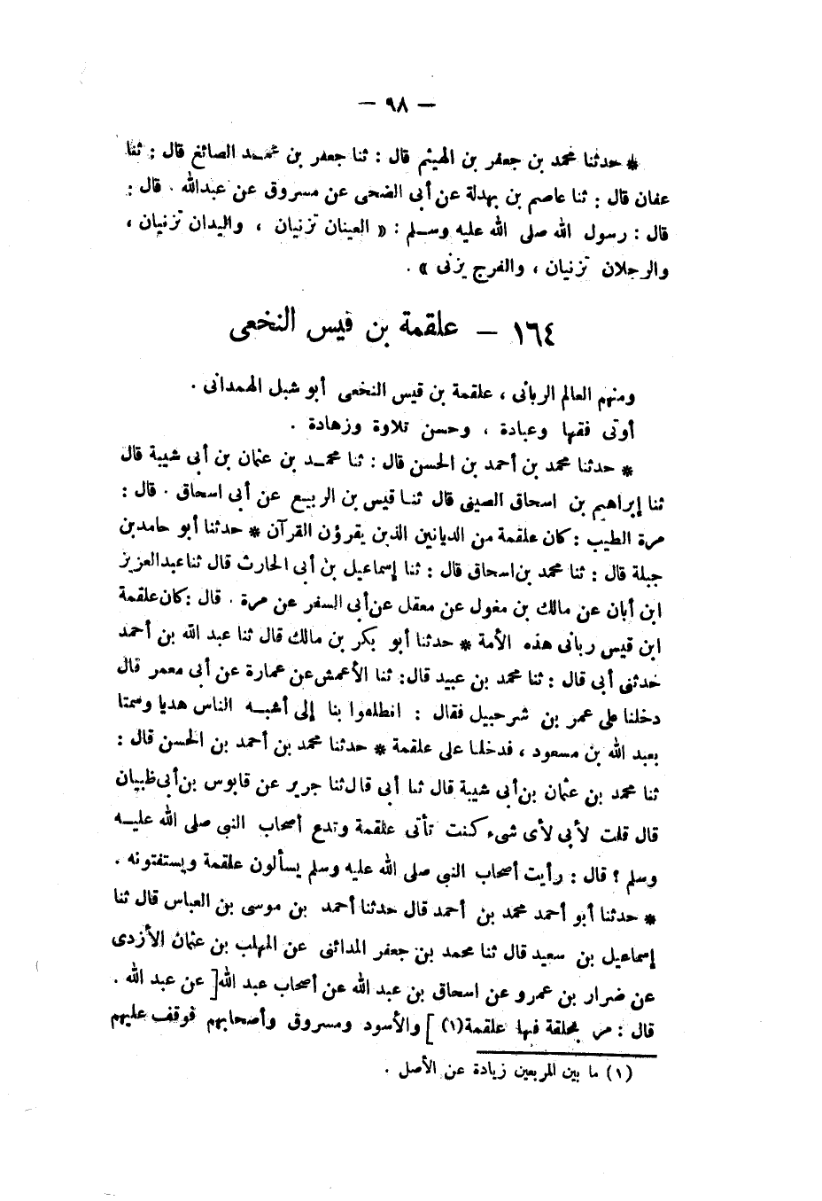 حَدَّثَنَا مُحَمَّدُ بْنُ أَحْمَدَ بْنِ الْحَسَنِ، قَالَ: ثنا مُحَمَّدُ بْنُ عُثْمَانَ بْنِ أَبِي شَيْبَةَ، قَالَ: ثنا إِبْرَاهِيمُ بْنُ إِسْحَاقَ الصِّينِيُّ، قَالَ: ثنا قَيْسُ بْنُ الرَّبِيعِ، عَنْ أَبِي إِسْحَاقَ، قَالَ مُرَّةُ الطَّيِّبُ: «§كَانَ عَلْقَمَةُ مِنَ الدَّيَّانِينَ الَّذِينَ يَقْرَءُونَ الْقُرْآنَ»