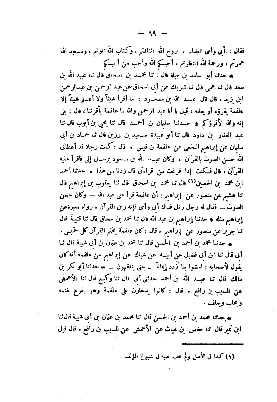 حَدَّثَنَا أَحْمَدُ بْنُ مُحَمَّدِ بْنِ الْحُصَيْنِ، قَالَ: ثنا مُحَمَّدُ بْنُ إِسْحَاقَ، قَالَ: ثنا يَعْقُوبُ بْنُ إِبْرَاهِيمَ، قَالَ: ثنا هُشَيْمٌ، عَنْ مَنْصُورٍ، عَنْ إِبْرَاهِيمَ: أَنَّ عَلْقَمَةَ، " §قَرَأَ عَلَى عَبْدِ اللهِ وَكَانَ حَسَنَ الصَّوْتِ فَقَالَ لَهُ رَجُلٌ: رَتِّلْ فِدَاكَ أَبِي وَأُمِّي فَإِنَّهُ زَيْنُ الْقُرْآنِ " رَوَاهُ مُغِيرَةُ، عَنْ إِبْرَاهِيمَ مِثْلَهُ